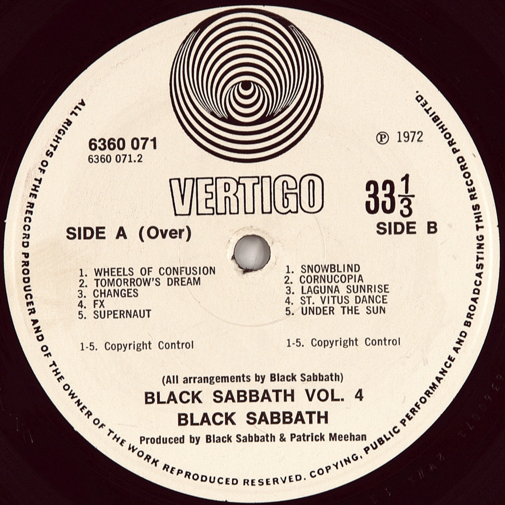 BLACK SABBATH-BLACK SABBATH VOL 4 (SWIRL)-1972- ПЕРВЫЙ ПРЕСС UK-VERTIGO номер 6360071.Очень редкий британский оригинал. Альбом поднялся до 8 в UK Albums Chart и до 13 в Billboard 200. Журнал Kerrang! поставил альбом на 48-е место в списке «100 величайших металических альбомов всех времен».В 2000 году журнал Q поставил Vol.4 на 60 место в списке «100 Величайших британских альбомов».
