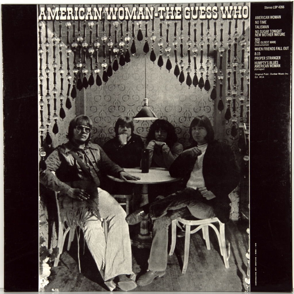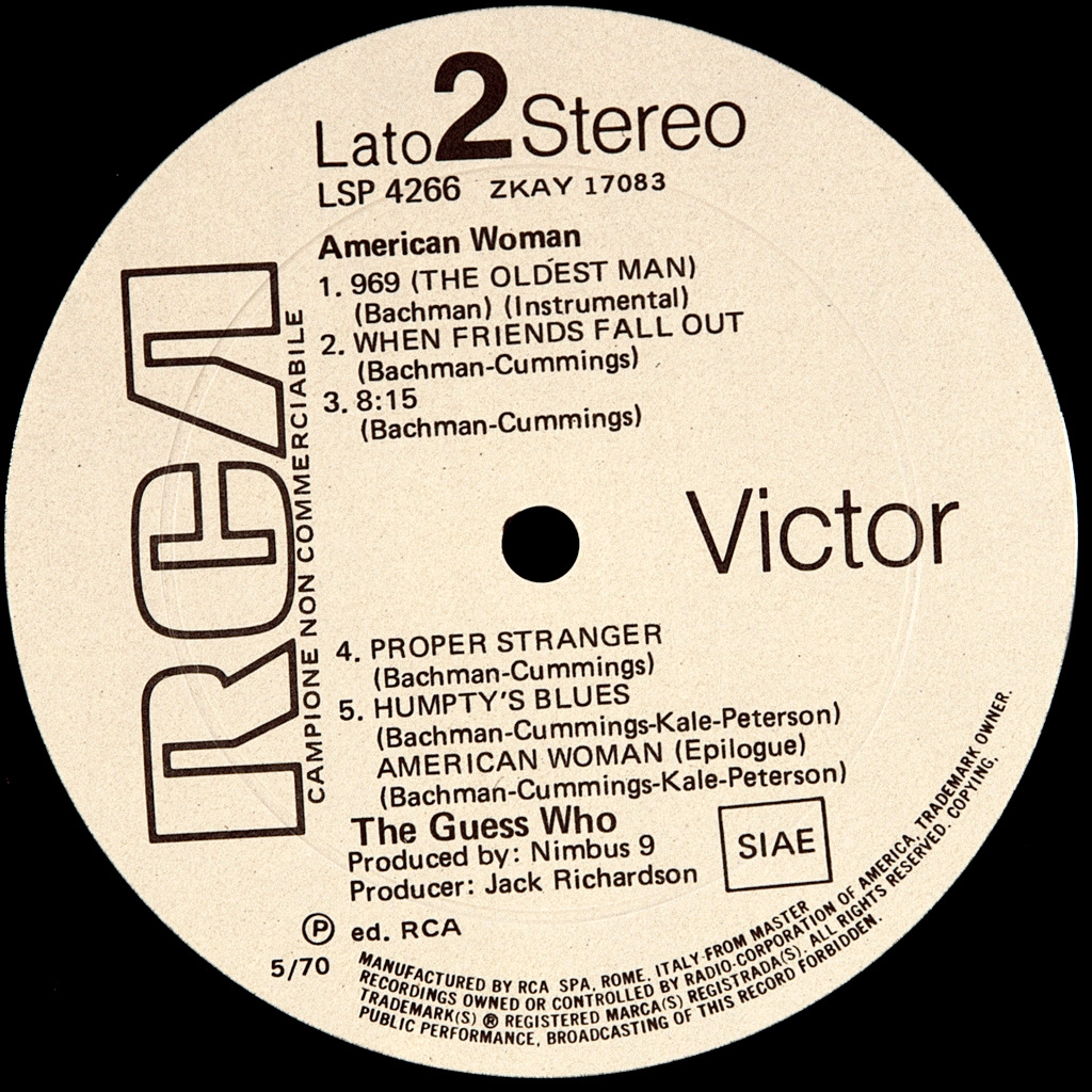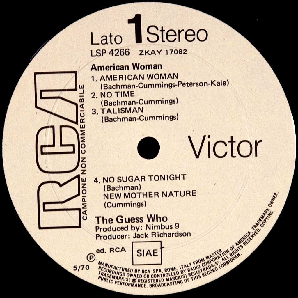 GUESS WHO - AMERICAN WOMAN (ПРОМО)-1970-ПЕРВЫЙ ПРЕСС ITALY-RCA VICTOR номер LSP4266. American Womanа является шестой студийный альбом по канадской рок группы The Guess Who. Альбом достиг максимума в # 9 на Billboard Albums Pop . Он оставался в чартах более года и был их самым успешным выпуском с более чем 20 миллионами проданных копий.