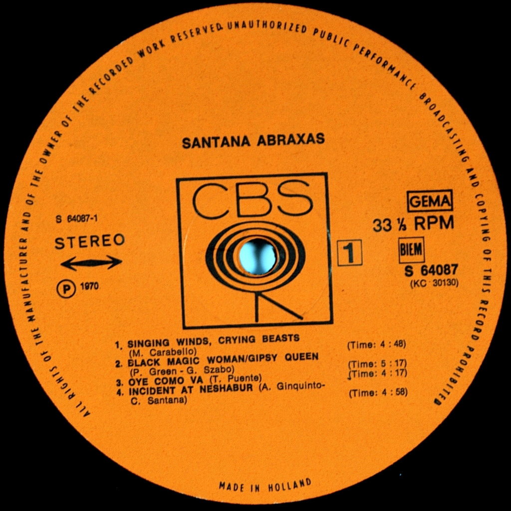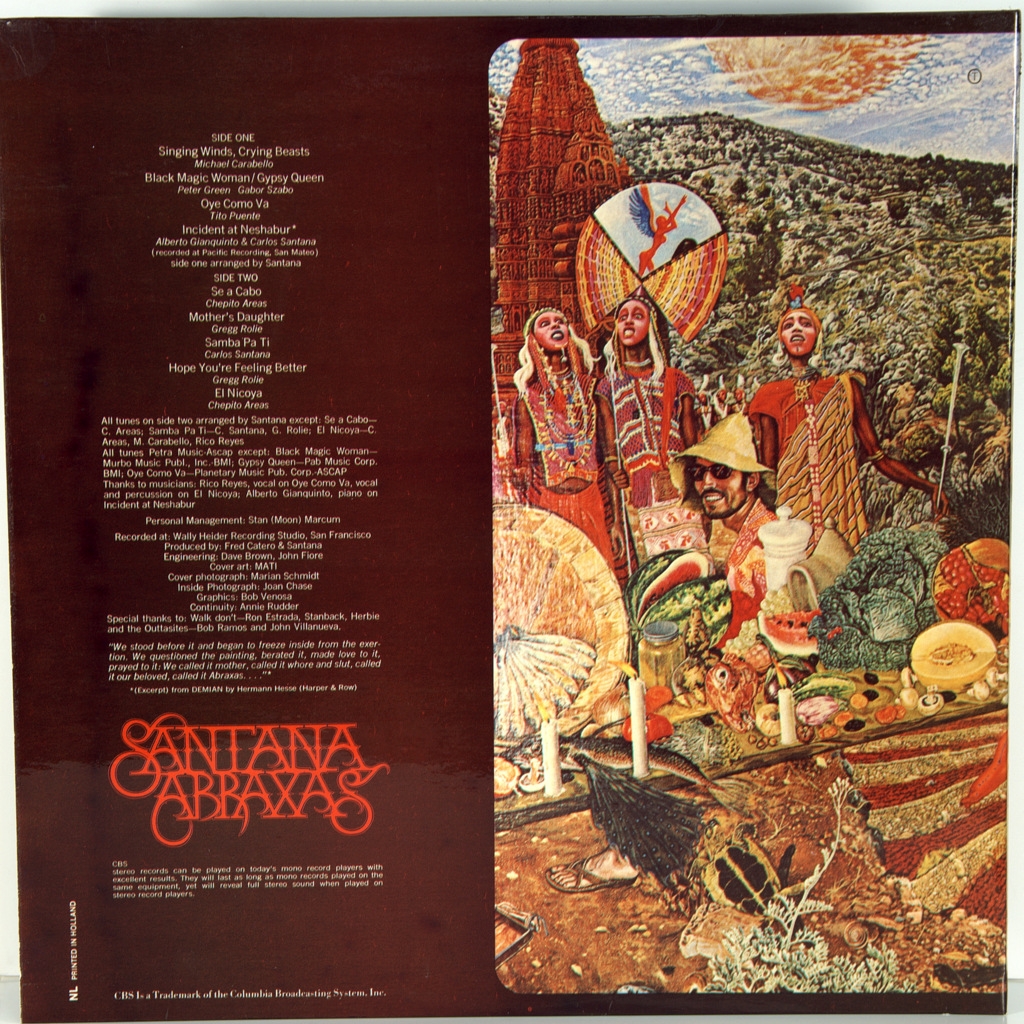 SANTANA-ABRAXAS-1970-ПЕРВЫЙ ПРЕСС HOLLAND-CBS номер S64087. Редкий оригинал. Abraxas-второй студийный альбом группы Santana, играющей латинский рок во главе с гитаристом Carlos Santana. Выпущенный в сентябре 1970 года альбом вобрал в себя влияния рока, блюза, джаза, сальсы, стал образцом, характерным для раннего звучания Santana, и показал музыкальное развитие группы с момента выхода её первого альбома. Этот альбом Santana многие считают лучшим. В 2003 году альбом занял 205-е место в списке журнала Rolling Stone «500 величайших альбомов всех времён». Альбом добрался до 7-го места в UK Album Chart.