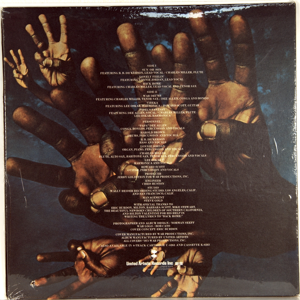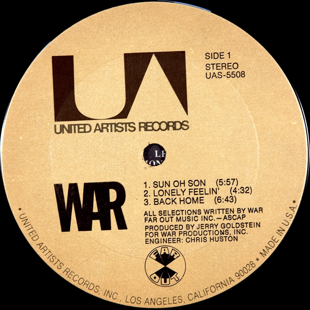 WAR -WAR-1971 -ПЕРВЫЙ ПРЕСС USA-UNITED ARTIST-UAS-5508. Редкий американский оригинал. War — американская фанк-группа из Калифорнии, известная по хитам «Low Rider», «Spill the Wine», «Summer», «Why Can’t We Be Friends?», «The Cisco Kid» и «The World Is a Ghetto». Была сформирована в 1969 году и с самого начала музыкально подходила сразу для нескольких жанровых чартов, смешивая стили — рок, фанк, джаз, латиноамериканскую музыку, ритм-н-блюз и регги.