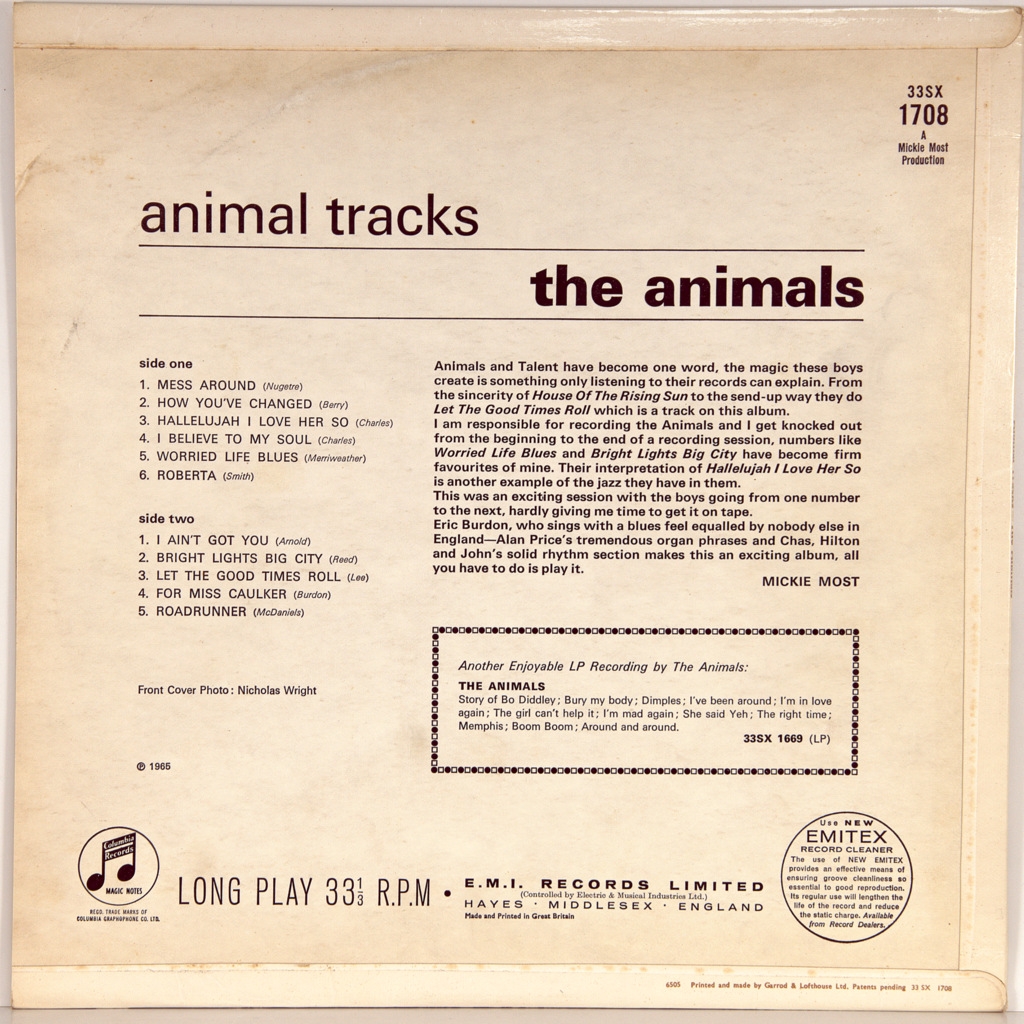 ANIMALS-ANIMALS TRACKS-1965-ПЕРВЫЙ ПРЕСС UK-COLUMBIA номер 33SX1708. Матрицы A-1/B-1 .Стампера 1GP/1GM. Редкий британский оригинал культовой рок группы. Animal Tracks - второй студийный альбом британской группы The Animals, выпущенный в 1965 году. В США пластинка была выпущена под тем же названием, но с другими обложкой и трек-листом. Альбом занял шестое место в британских чартах.