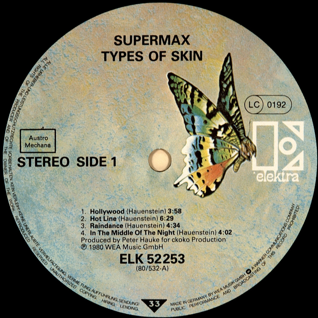 SUPERMAX-TYPES OF SKIN-1980-ПЕРВЫЙ ПРЕСС AUSTRIA-ELEKTRA номер ELK52253. Очень редкий австрийский оригинал культового альбома. «Supermax»-музыкальный проект австрийского композитора Kurt Hauenstein, созданный в сотрудничестве с продюсером Peter Hauke. Наилучший за всю деятельность проекта, альбома «Types of Skin», посвящен полицейской расправе с чернокожим населением резервации Соуэто. Официально вышел в свет 3 октября 1980 года, при этом все композиции альбома через непродолжительное время стали хитами.