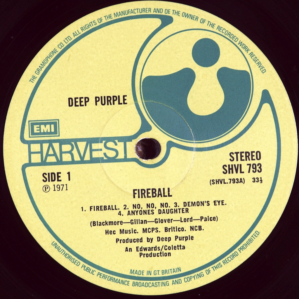 DEEP PURPLE-FIREBALL-1971-ПЕРВЫЙ ПРЕСС UK-HARVEST номер SHVL793 Матрицы A-2U/B-3U