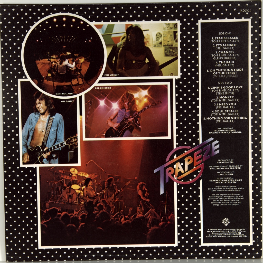 TRAPEZE-TRAPEZE-1975-ПЕРВЫЙ ПРЕСС UK-WARNER BROS. номер K56165. Редкий британский оригинал.Trapeze - пятый студийный альбом английской хард-рок- группы Trapeze . Записано с продюсером Steve Smith в студии Island Studios в Лондоне, оно было выпущено в 1975 году компанией Warner Bros. Records . Альбому предшествовал выход одного сингла - кавер-версии «On the Sunny Side of the Street », первоначально записанной Frank Sinatra. Музыкальный сайт AllMusic наградил Trapeze двумя из пяти звезд.
