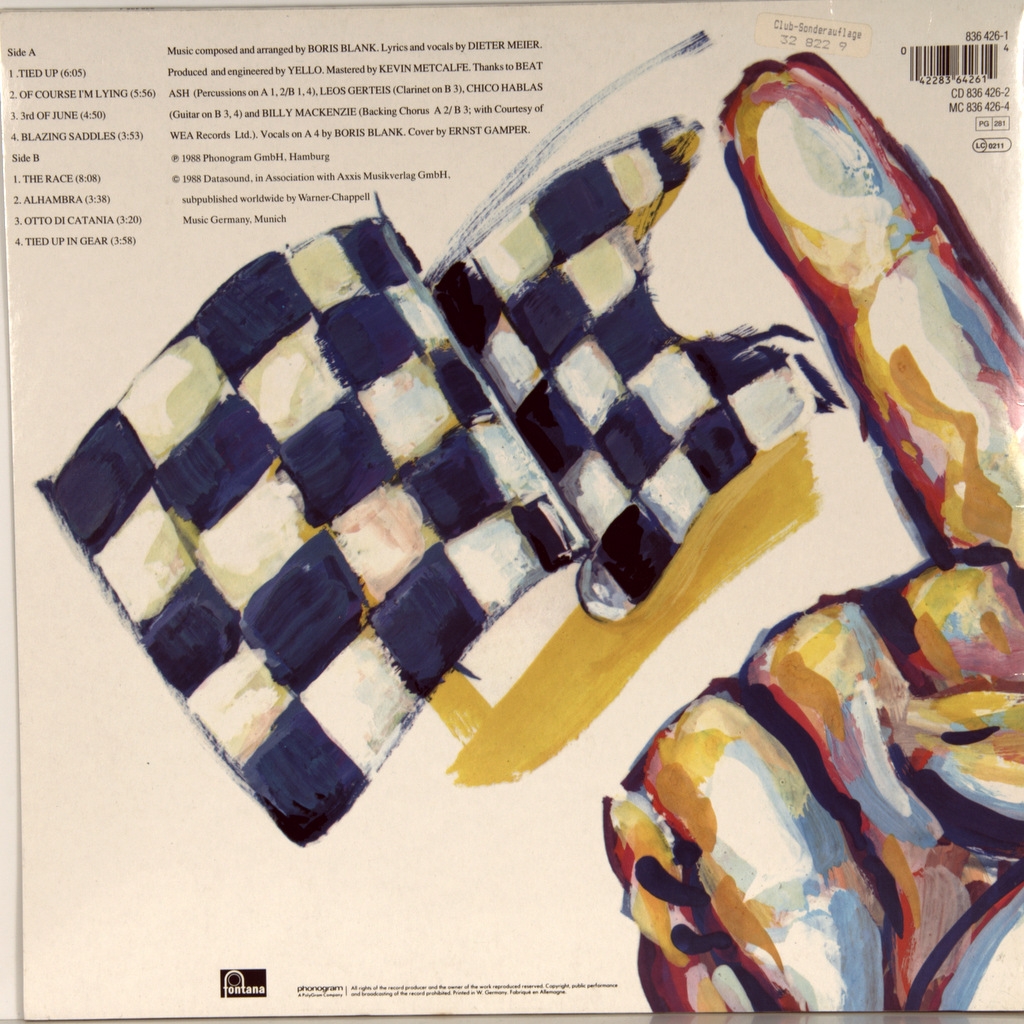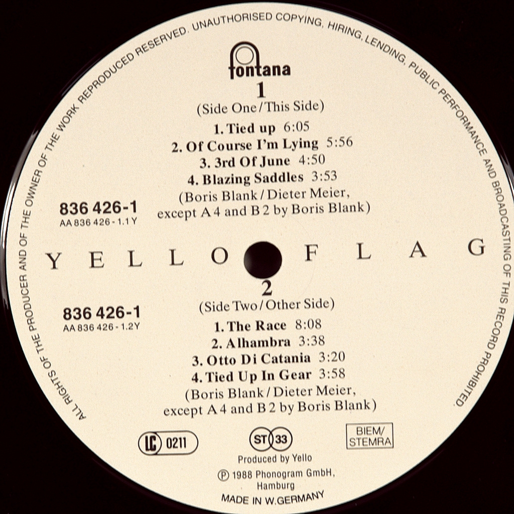 YELLO-FLAG-1988-ПЕРВЫЙ ПРЕСС GERMANY-FONTANA номер 836426-1. Редкий оригинал Flag - это шестой студийный альбом швейцарского электронного дуэта Yello , выпущенный в 1988 году. Он включает восьмиминутную версию " The Race ", отредактированная версия которой достигла 7-го места в британском чарте синглов в августе того же года.