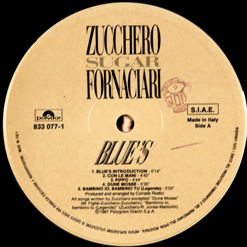 ZUCCHERO-BLUE'S-1987 ПЕРВЫЙ ПРЕСС ITALY-POLYDOR-833077-1. Blue's-четвертый студийный альбом итальянской звезды Zucchero Fornaciari . Альбом был выпущен 15 июня 1987 года и зачислен в "Zucchero Sugar Fornaciari". Продано около 1,5 миллионов копий в Италии, став самым продаваемым альбомом на международном уровне итальянцем, пока его не обогнал следующий студийный альбом Oro Incenso & Birra выпущенный в 1989 году.
