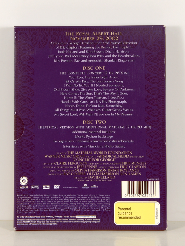 Уникальная, вручную сделанная (в количестве нескольких тысяч штук) концертная программа, выдаваемая посетителям единственного мемориального концерта в Королевском Альберт-Холле, посвященного первой годовщине смерти George Harrison. В комплекте идет оригинальный двойной DVD с полной версией этого знаменательного события.