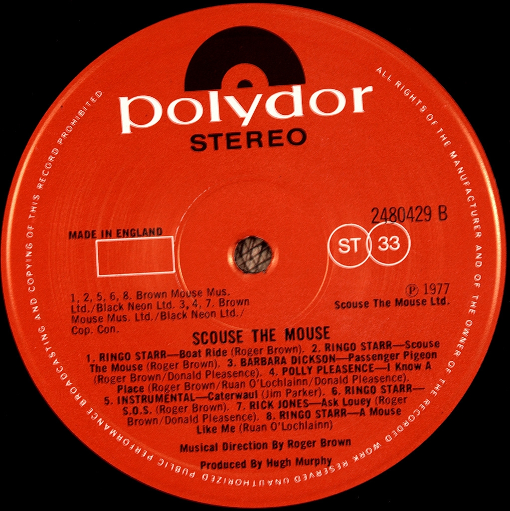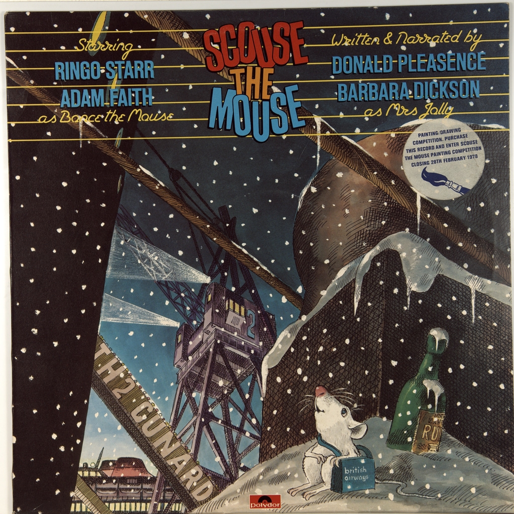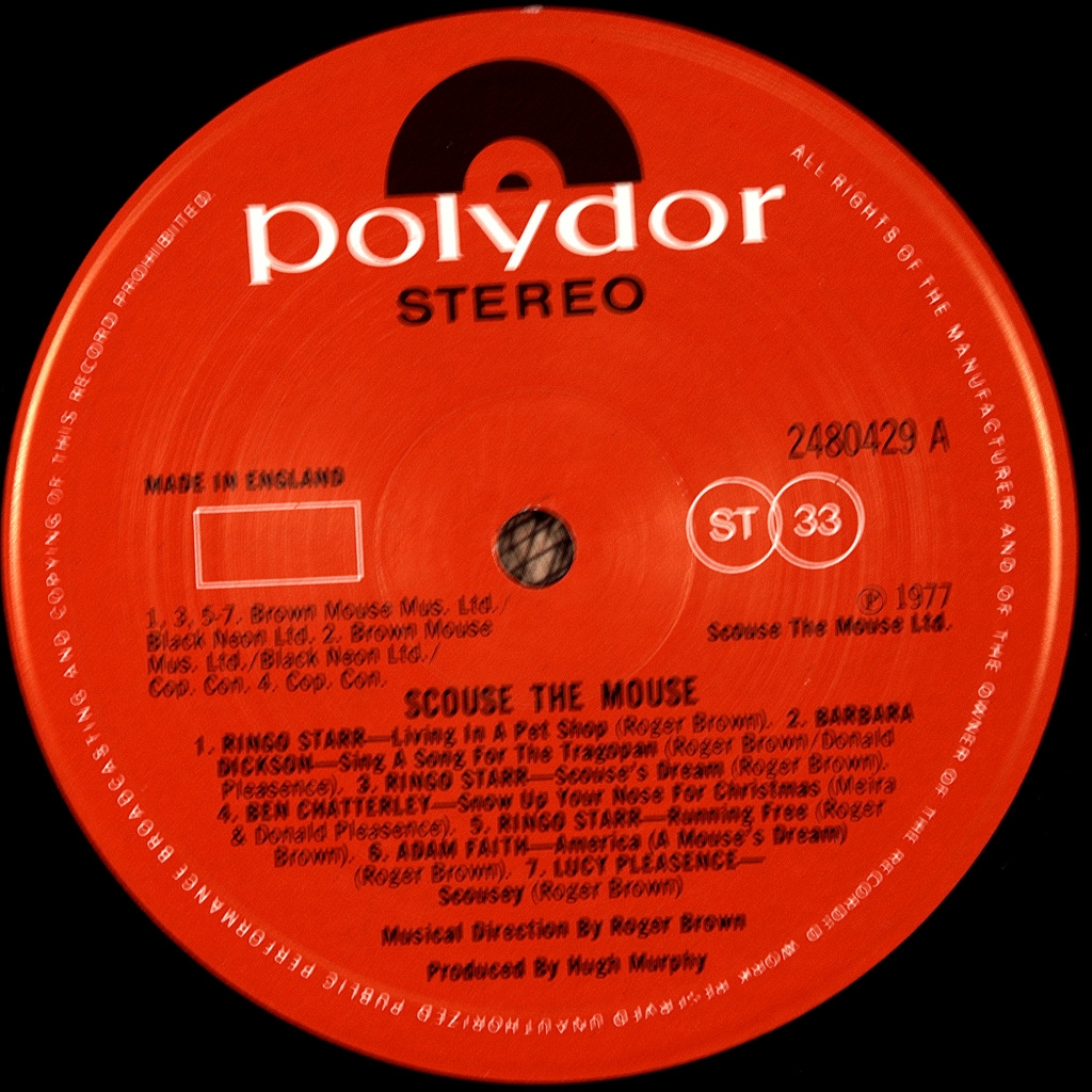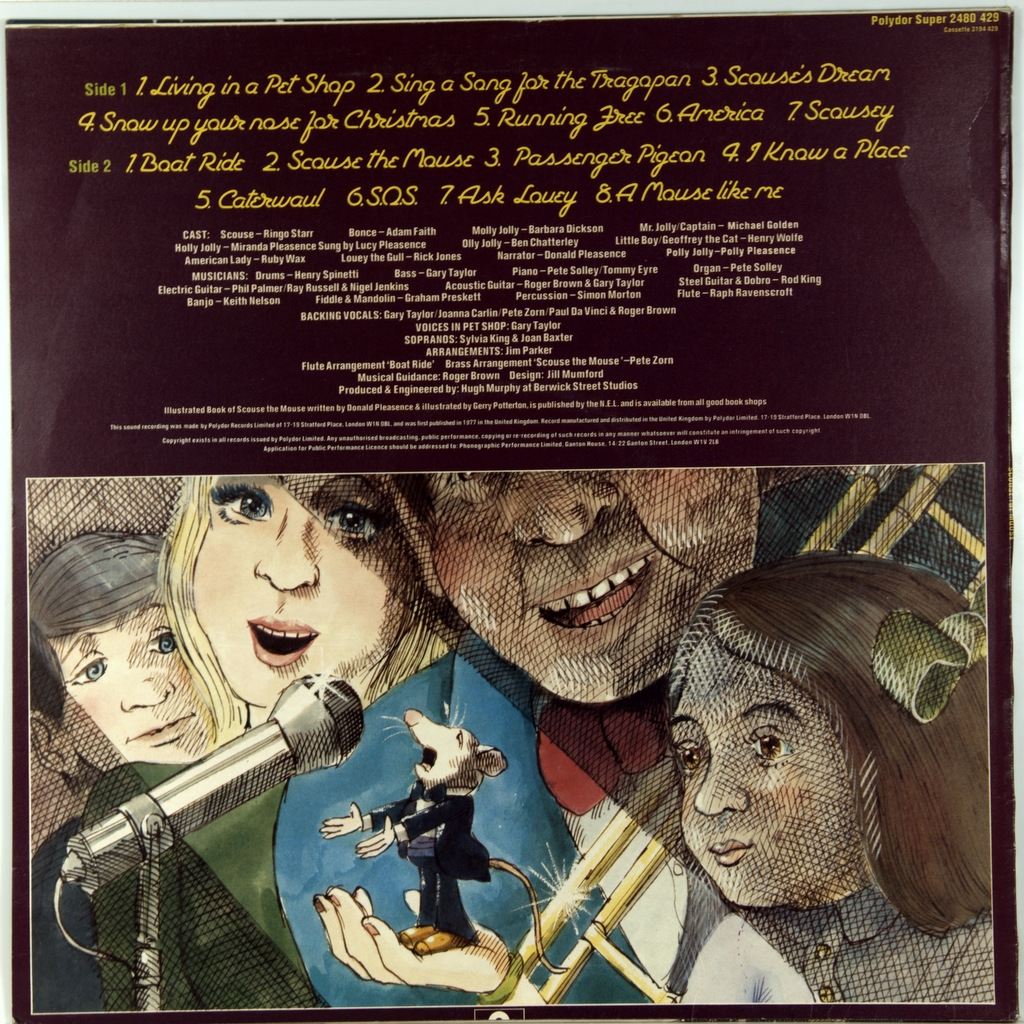 RINGO STARR,ADAM FAITH-SCOUSE THE MOUSE-1977-ПЕРВЫЙ ПРЕСС UK-POLYDOR- 2480429. Мега редкий альбом записанный к мультфильму. Scouse the Mouse (произносится как «Ска́уз зи Ма́ус»; рус. Ска́уз Мышь) — альбом музыки для детей, с участием Ринго Старра (как вокалиста), а также других артистов и музыкантов, выпущенный 9 декабря 1977 в Великобритании лейблом Polydor Records. Старр исполняет роль основного персонажа сюжета, Scouse the Mouse, который эмигрирует из Ливерпуля в США. «Скауз» — слово, обозначающее и прозвище жителей Ливерпуля в Британии, и ливерпульский акцент или диалект. Других основных персонажей играют Адам Фэйт (журналист, актёр и певец, многократно добивавшийся успеха в британских чартах 1960-х) («Bonce the Mouse») и Барбара Диксон (шотландская певица) («Molly Jolly»). Мультипликационная телевизионная версия истории, рассказанной в альбоме, планировалась к показу по телесети ITV, но показ задерживался в связи с забастовкой, а затем был совсем отменён. Альбом, ставший третьим и последним изданием Старра на Polydor Records (в соответствии с заключённым между ними контрактом), в США не издавался. По состоянию на 2012 год, альбом не переиздавался на CD-диске.