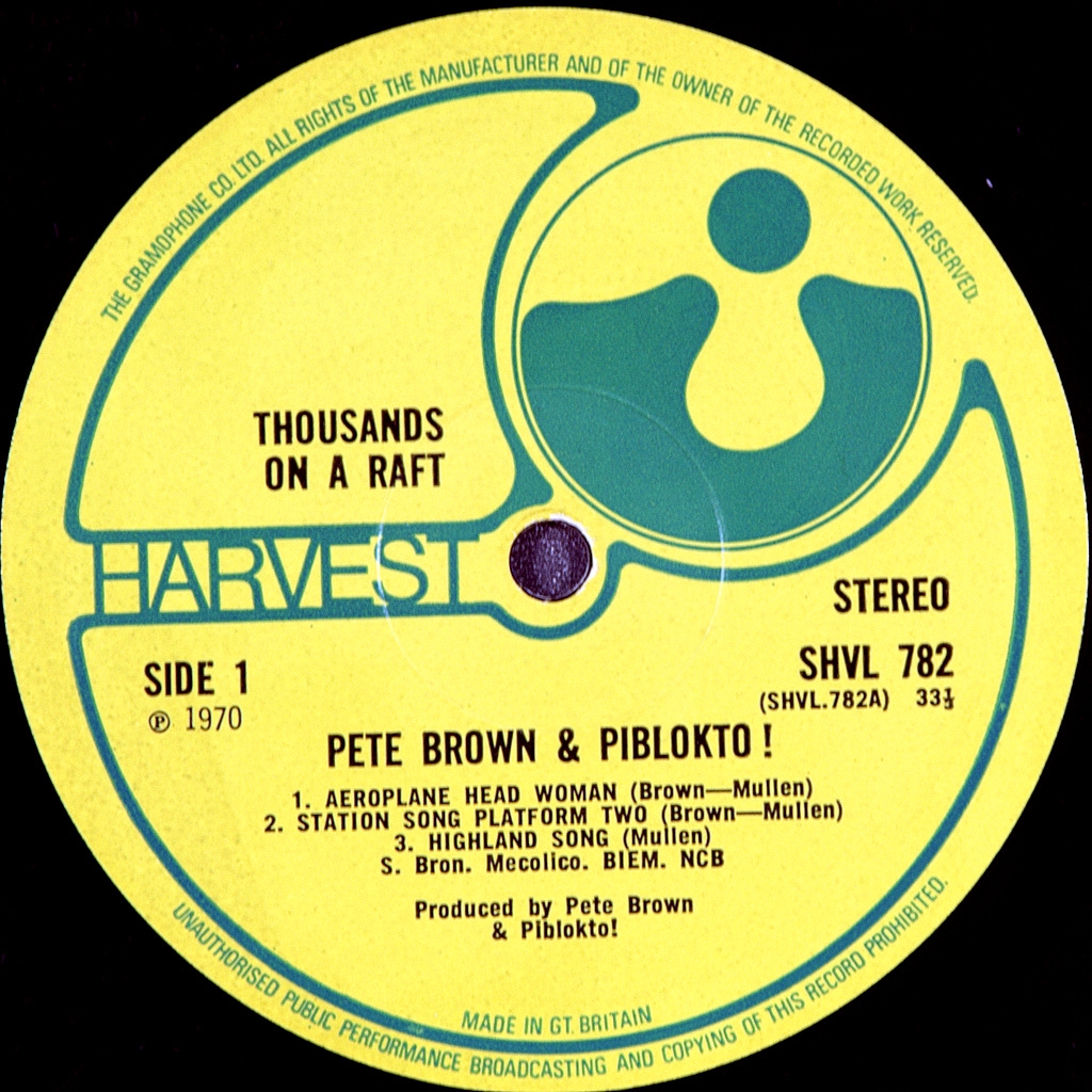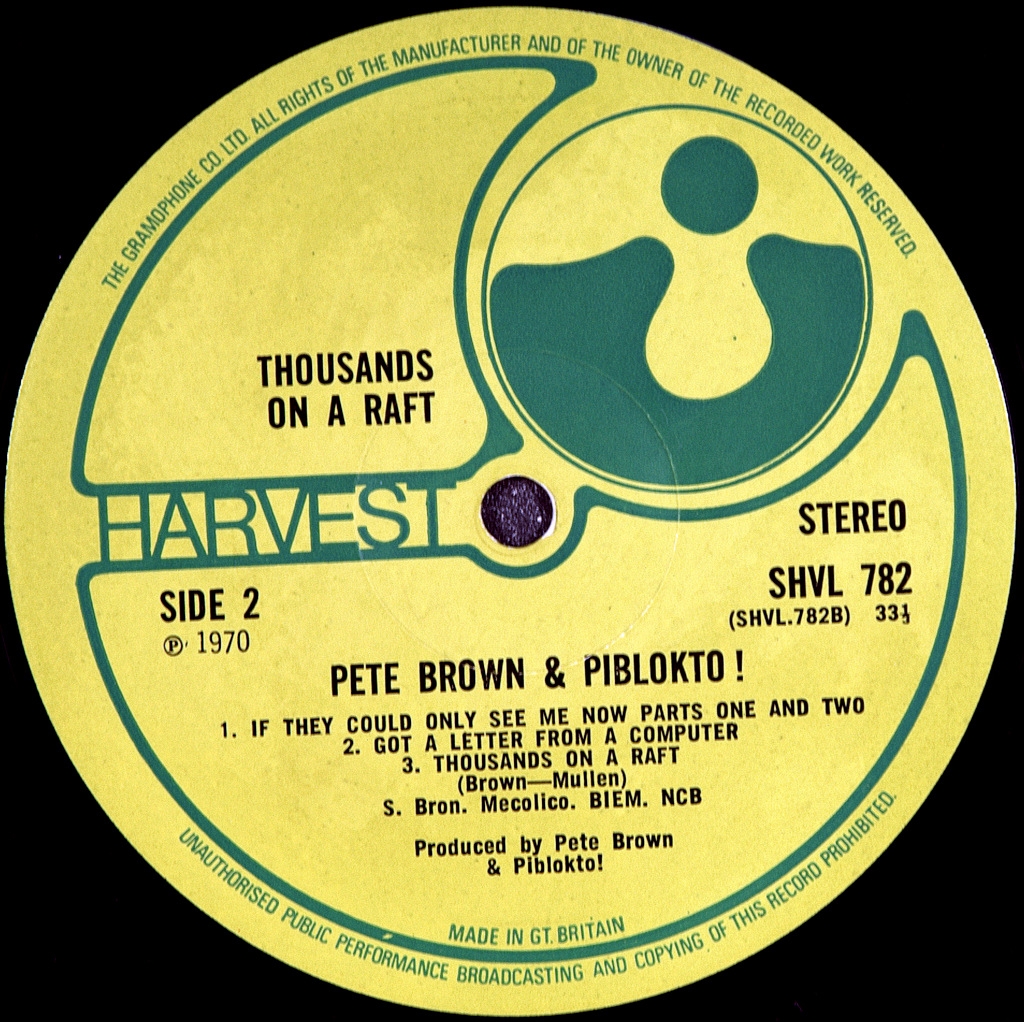 PETE BROWN AND PIBLOKTO-THOUSANDS ON A RAFT-1970-ПЕРВЫЙ ПРЕСС UK-HARVEST-SHVL782. Матрицы A-1G/B-1G , стампера 1A/1R (Мечта!) . Очень редкий оригинал культовой группы в прог-блюз-психоделии. Альбом Thousands On A Raft, более близкий к прогрессиву, ещё более сложный и интересный чем раннии работы. Композиции стали более продолжительными, вплоть до 17-ти минут, активизировался всплывавший ранее лишь эпизодически меллотрон, появились украшения в виде саксофона, а материал стал гораздо более разноплановым и тонко аранжированным.