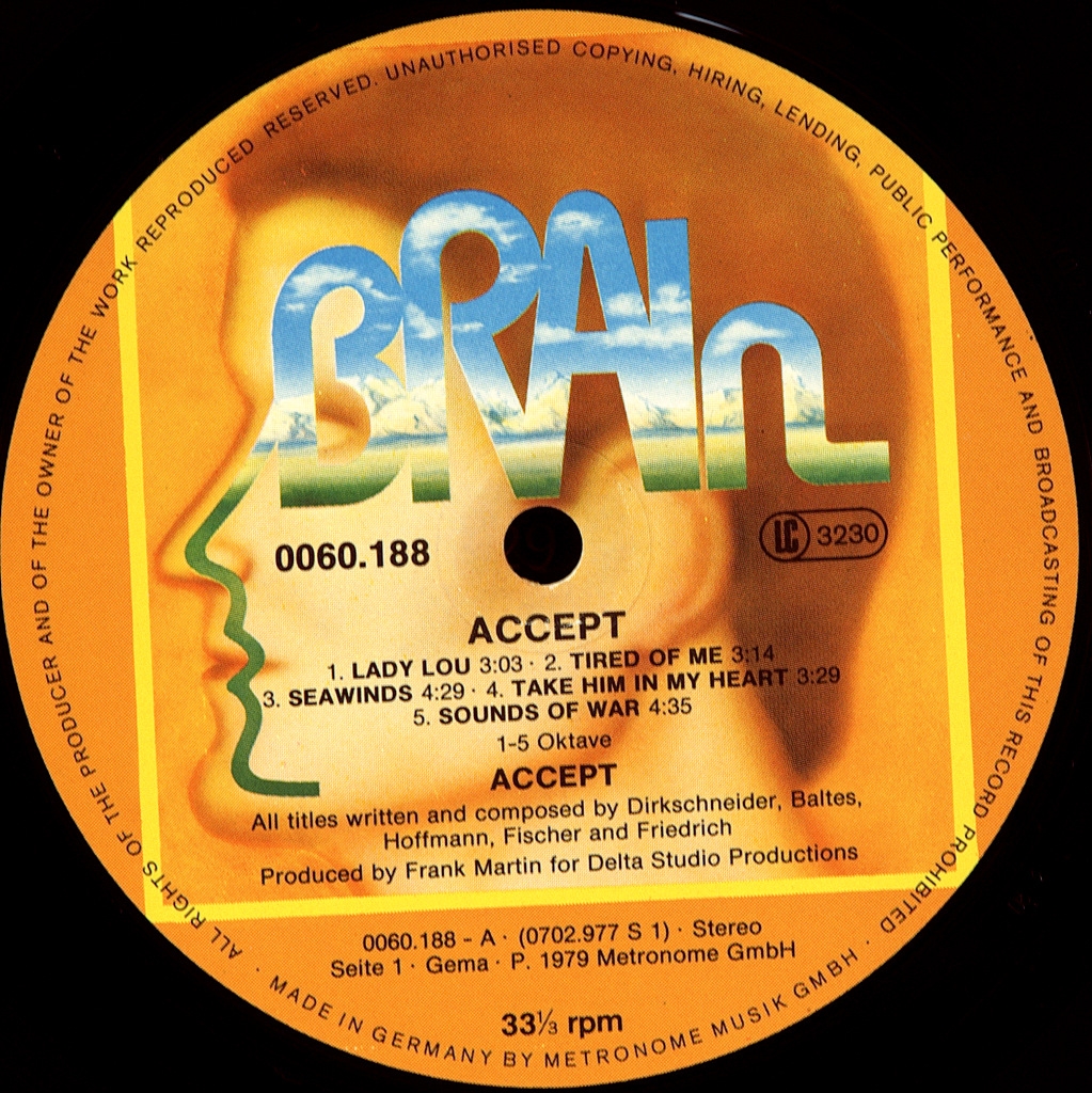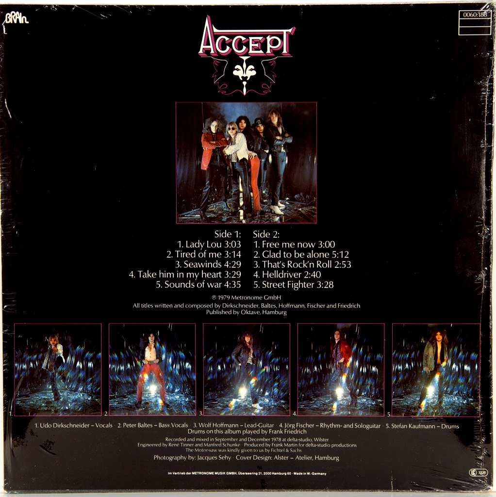 ACCEPT-ACCEPT-1979-ПЕРВЫЙ ПРЕСС GERMANY-BRAIN-60.188. Редкий германский оригинал первого альбома культовой группы. В 1977 году группа смогла подписать контракт со звукозаписывающей компанией Brain и в сентябре 1978 года в студии в Гамбурге группа приступила к записи полноценного дебютного альбома. Материал на дебютном альбоме был достаточно далёк от наиболее узнаваемых впоследствии альбомов группы, определивших её стиль, однако уже содержал некоторые фирменные черты группы: узнаваемый голос певца Удо Диркшнайдера и звук сдвоенных гитар. Для своего времени этот альбом был весьма жёстким и мощным.В записи некоторых партий ударных, с которыми не справлялся Франк Фридрих, принимал участие Штефан Кауфманн. Альбом в январе 1979 года был выпущен в ФРГ, а затем во Франции, Японии, Греции, Канаде, Испании. В США альбом был выпущен пробным маленьким тиражом, который пришлось допечатывать.