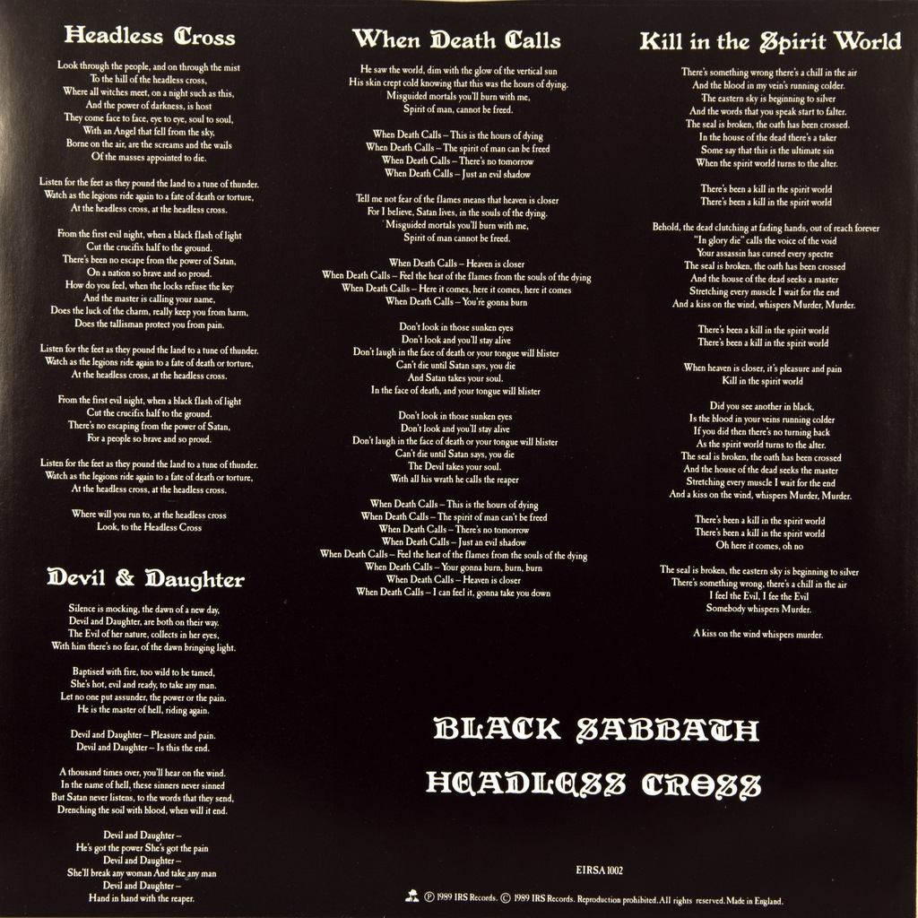 BLACK SABBATH-HEADLESS CROSS-1989-ПЕРВЫЙ ПРЕСС UK-IRS-EIRSA1002. Мега редкий британский оригинал. Headless Cross — четырнадцатый студийный альбом британской хеви-метал-группы Black Sabbath, вышел в 1989 году. Headless Cross — первый диск группы с ударником Кози Пауэллом. В записи альбома принимал участие бас-гитарист Лоуренс Коттл, но официально никогда не входил в состав группы.