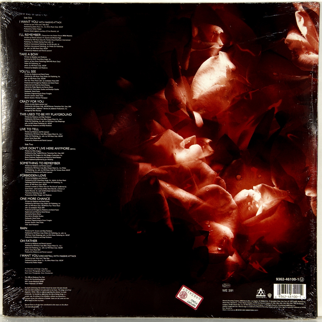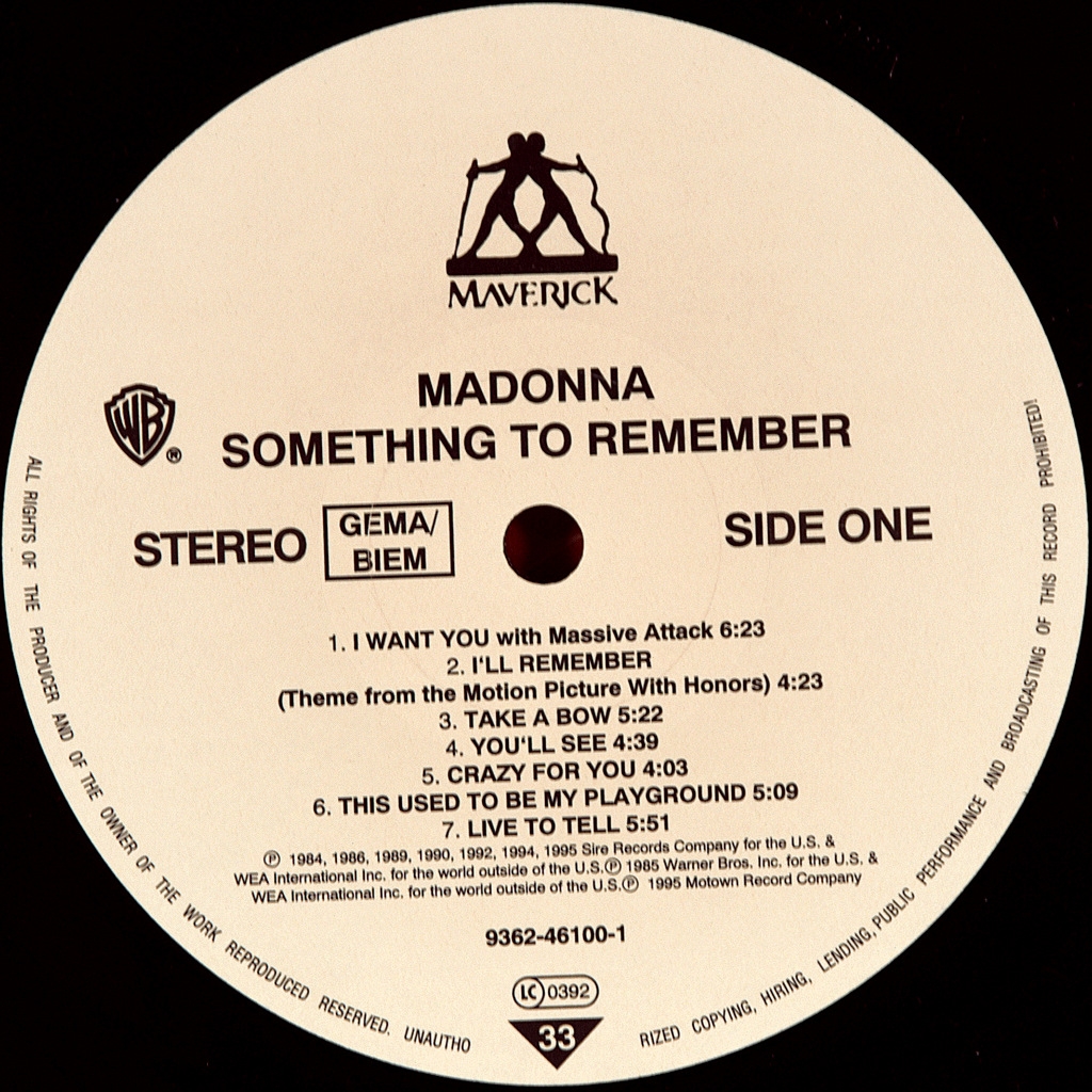 MADONNA-SOMETHING TO REMEMBER-1995-ПЕРВЫЙ ПРЕСС UK/EU-GERMANY-SIRE/WARNER-9362-46100-1. Мега редкий оригинал королевы поп музыки. Something to Remember — третий сборный альбом американской певицы Мадонны, выпущенный 7 ноября 1995 года лейблом Maverick Records. Он содержит сборник лучших хитов с тремя новыми песнями: «I Want You», «You'll See» и «One More Chance». Также в альбом включён новый ремикс трек «Love Don’t Live Here Anymore» с альбома Like a Virgin 1984 года. RIAA сертифицировала альбом как платиновый 3 октября 2000 года, зафиксировав продажу 3 миллионов копий в Америке. Всего в мире было продано около 8 миллионов экземпляров альбома.