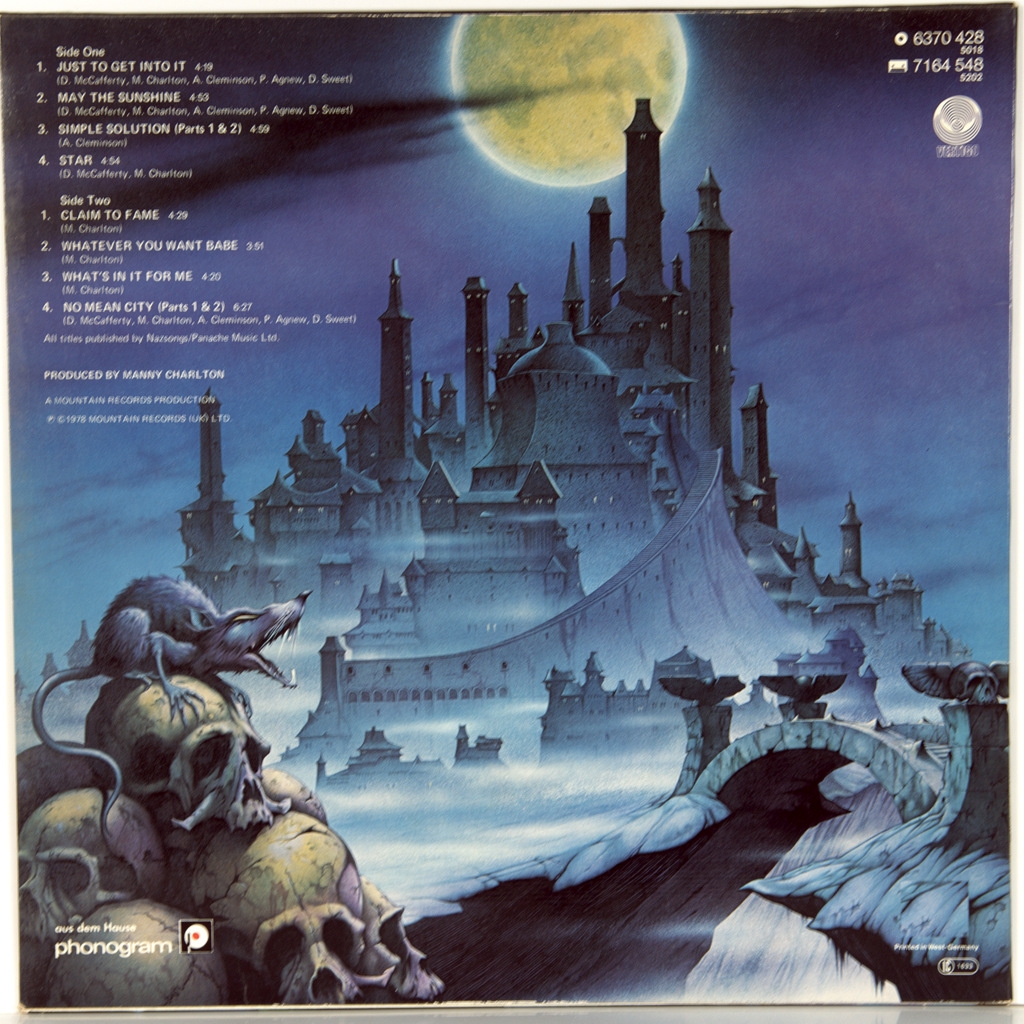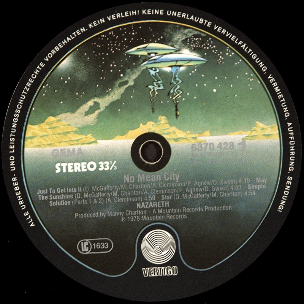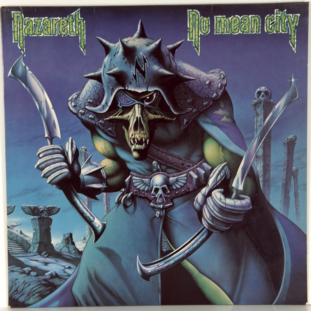 NAZARETH,NO MEAN CITY-1978- ПЕРВЫЙ ПРЕСС GERMANY-VERTIGO номер 6370428. Редкий германский оригинал. Десятый студийный альбом группы Nazareth. Обложку альбома нарисовал Родни Мэттьюз, известный английский художник-иллюстратор в стиле фэнтези, создавший обложки для работ многих других исполнителей (Scorpions, Thin Lizzy и других) Название диска позаимствовано из романа Александра МакАртура и Кингсли Лонга «No Mean City» (1935 год). С этого альбома звучание группы стало тяжелее, учитывая добавление гитариста Zal Cleminson из Sensational Alex Harvey Band. Популярность альбома позволила группе выступить с несколькими громкими именами, такими как Thin Lizzy, в их туре 1978/79 годов.
