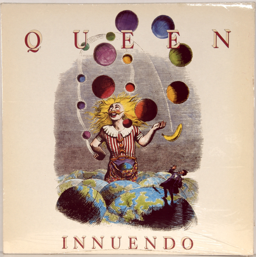 UEEN-INNUENDO-1991-ПЕРВЫЙ ПРЕСС ITALY-PARLOPHONE-64-7958871. Очень редкий итальянский оригинал культового альбома. Innuendo — четырнадцатый студийный альбом британской рок-группы «Queen». Выпущен 4 февраля 1991 года. Последний альбом «Queen», записанный и выпущенный при жизни Фредди Меркьюри. Название Innuendo содержит «косвенный намёк» на то, что группа в таком составе просуществует совсем недолго. Последние песни очень нелегко давались Фредди, который был уже тяжело болен. Тем не менее, альбом был закончен и прекрасно принят публикой. В его поддержку было снято несколько клипов, один из которых, «These Are The Days of Our Lives», стал последним видео с участием Меркьюри.Несмотря на смешанные оценки критики, новый альбом Queen достиг первой строчки в альбомных чартах Голландии, Швейцарии, Италии, Германии и родной Великобритании став дважды платиновым.