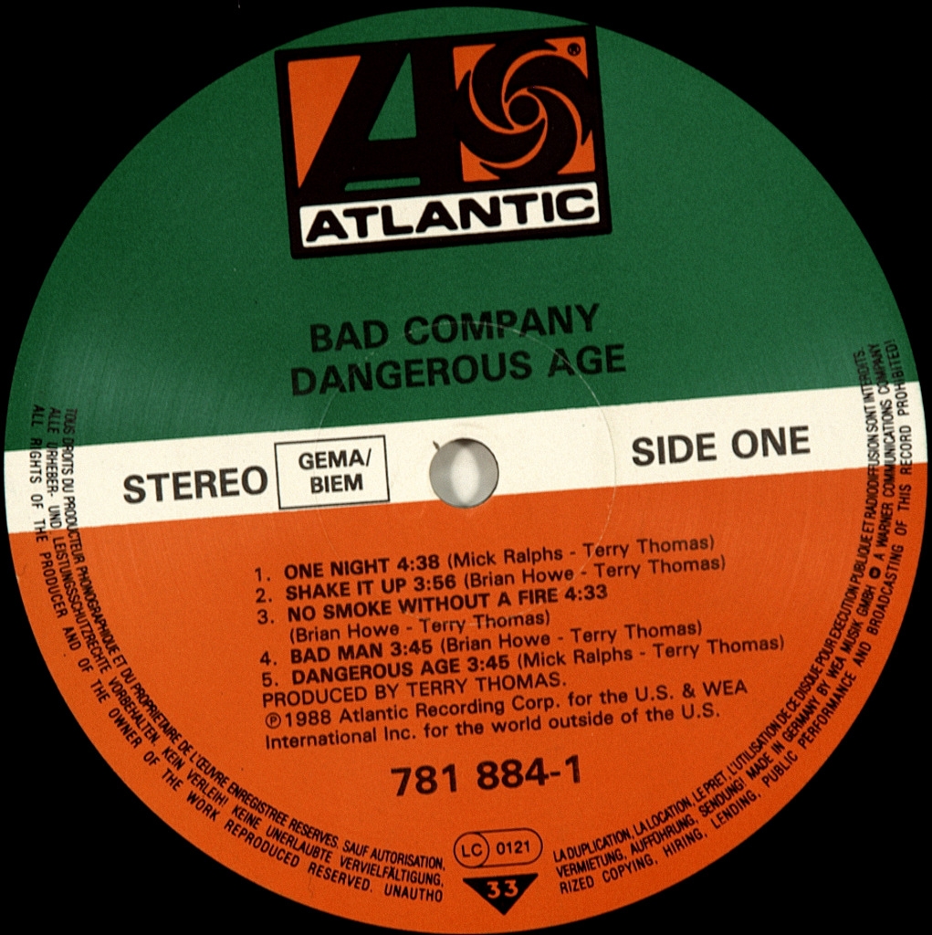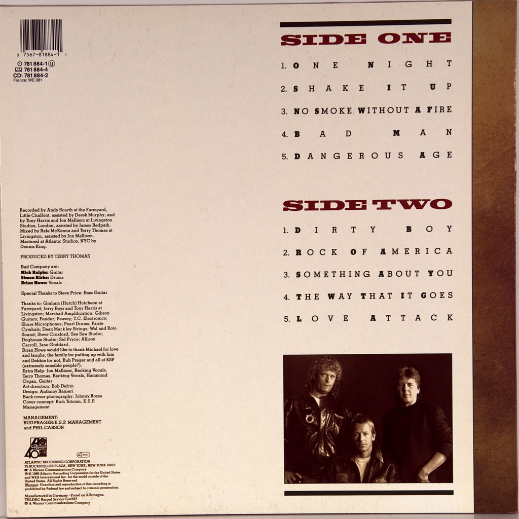 BAD COMPANY-DANGEROUS AGE-1988-ПЕРВЫЙ ПРЕСС UK/EU-GERMANY-ATLANTIC номер 781 884-1. Редкий оригинал ветеранов блюз-рока. DANGEROUS AGE-восьмой студийный альбом группы Bad Company . Альбом был выпущен 23 августа 1988 года. Это был их второй альбом с Brian Howe в качестве вокалиста и Steve Price в качестве бас-гитариста. Треков "No Smoke Without A Fire" (# 4), "One Night" (# 9) и "Shake It Up" (# 9) достигли Топ 10 в чарте Billboard Magazines Album Rock Tracks chart.