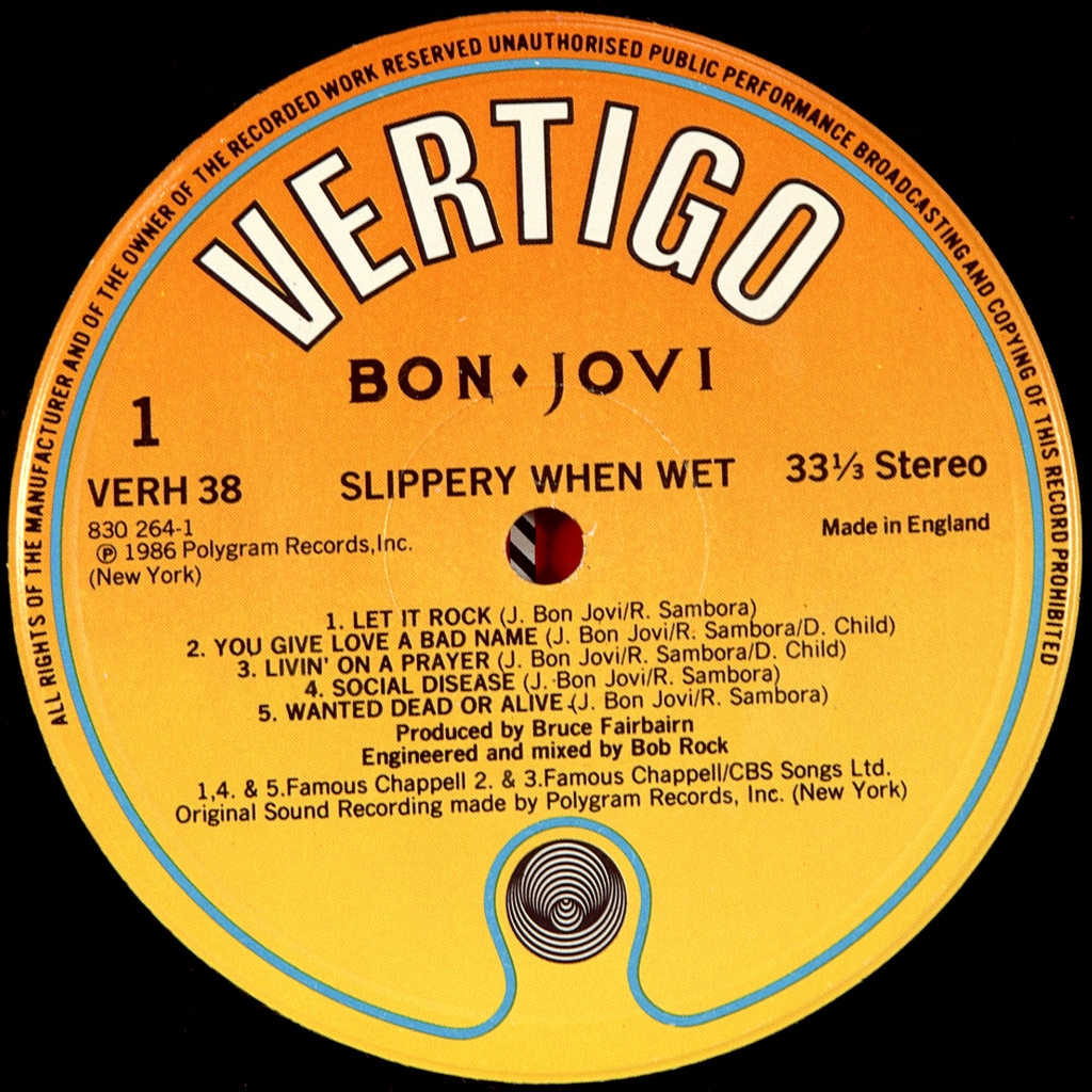 BON JOVI-SLIPPERY WHEN WET-1986-ПЕРВЫЙ ПРЕСС UK-VERTIGO-VERH38. Редкий британский оригинал культовых хард-рокеров. Slippery When Wet — третий студийный альбом группы Bon Jovi, выпущенный в августе 1986 года на Vertigo Records. Альбом включает в себя песни, которые сейчас считаются самыми известными песнями Bon Jovi, например «You Give Love a Bad Name», «Livin' on a Prayer» и «Wanted Dead Or Alive». Альбом провёл восемь недель на 1 месте The Billboard 200.