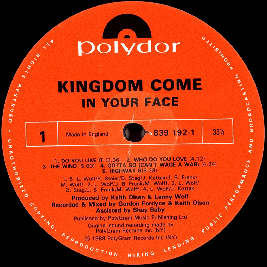 KINGDOM COME-IN YOUR FACE-1989-ПЕРВЫЙ ПРЕСС UK-POLYDOR номер 83912-1. Очень редкий британский пресс. Второй альбом немецкой / американской хард-рок группы Kingdom Come. Синглы с альбома попали в чарты Британии.