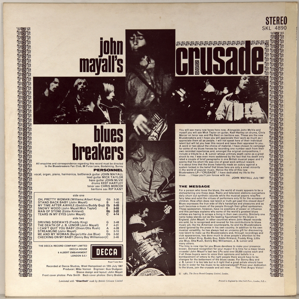 MAYALL, JOHN-CRUSADE-1967-ПЕРВЫЙ ПРЕСС UK-DECCA-SKL4890. Матрицы A-1W/B-1W. Очень редкий оригинал культового блюз рокера. С момента выхода предыдущего альбома А Hard Road в составе Блюзбрейкеров произошли заметные перемены: Питер Грин ушел собирать свою собственную группу (Fleetwood Mac), а Айнсли Данбар подался к Джеффу Беку. На вакантное место ударника Джон взял Кифа Хартли, а с заменой лидер-гитариста было сложнее - ведь новому музыканту пришлось бы выдерживать сравнение и с Клэптоном, и с Грином. Джон вспомнил, что на одном из концертов, когда Эрик по какой-то причине не появился вовремя, пришел молодой парнишка, который утверждал, что знает весь репертуар Блюзбрейкеров. У Мэйолла особого выбора не было, и он пригласил молодого гитариста на сцену. Тот продемонстрировал хорошее знание материала и отличную технику, и Джон был впечатлен его игрой. Но после концерта парнишка ушел, не оставив своих координат. Теперь Мэйолл хотел найти этого музыканта, и в конце концов смог это сделать, разместив объявление в Melody Maker. Так в группу пришел Мик Тэйлор, склонный более к блюз-року, а не к чистому блюзу. Состав группы был расширен привлечением двух саксофонистов - Криса Мерсера на теноре и Рипа Канта на баритоне. Этот секстет отправился в студию 11 и 12 июля для записи нового альбома, который продюсировал Майк Вернон, а в качестве звукоинженера вновь отметился Гас Даджеон.