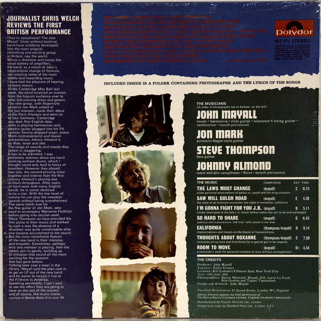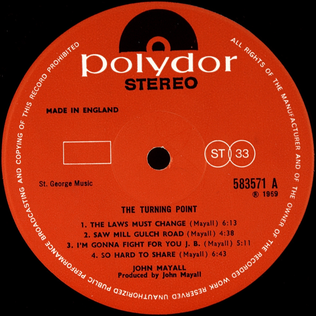 MAYALL, JOHN-THE TURNING POINT-1969-ПЕРВЫЙ ПРЕСС UK-POLYDOR-583571, Мега редкий британский оригинал в полной комплектации (постер-буклет). Альбом - для Джона Мейолла во всех отношениях поворотный пункт, точка отсчёта. Когда Джон Мэйолл создал новую группу после распада Bluesbreakers в мае 1969 года, он решил, что эта группа будет играть музыку с низким уровнем громкости - или музыку без «тяжелой гитары и ударных». Альбом "The Turning Point" был записан на концерте, который состоялся 12 июля 1969 года в Филлмор-Ист, Нью-Йорк. Исполнителями альбома были Джон Мейолл на вокале, гармонике, слайде и гитаре Fender Telecaster, тамбурине и перкуссии; Джон Марк на акустической гитаре; Стив Томпсон на басу и Джонни Алмонд на тенор и альт-саксофоне, флейте и перкуссии. Все песни на альбоме были написаны Джоном Майолом (а так же в соавторстве со Стивом Томпсоном). Трек «I'm Gonna Fight For You, JB» - дань уважения американскому блюз-гитаристу Дж. Б. Ленуару, который умер в 1967 году и оказал глубокое влияние на Джона Мэйолла. В альбоме всего семь песен на 48 минут. Иногда они кажутся затянутыми, но это лишь задумка Джона погрузить слушателей в атмосферу негромких звуков и ритмов. Все вещи хорошие и, в принципе, блюзовые, просто подача очень необычная и новая для того времени. Критики очень высоко оценили работу. ALLMUSIC ставит альбому наивысшую оценку -5 звезд.