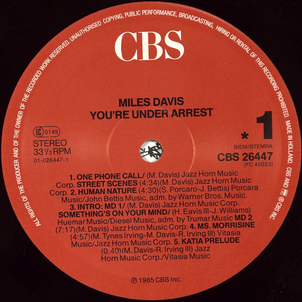 MILES DAVIS -YOU'RE UNDER ARREST-1985-ПЕРВЫЙ ПРЕСС UK/EU HOLLAND-CBS-CBS26447. You're Under Arrest-альбом 1985 года, записанный Майлзом Дэвисом, который видел, как Майлз смешивал поп-мелодии с политическими заявлениями о расизме, загрязнении и войне. Среди других треков в альбоме представлены интерпретации Дэвиса двух современных поп-песен: Синди Лаупер "раз за разом" и Майкла Джексона "Human Nature". По рейтингу ALLMUSIC альбом оценен на 3 звезды.