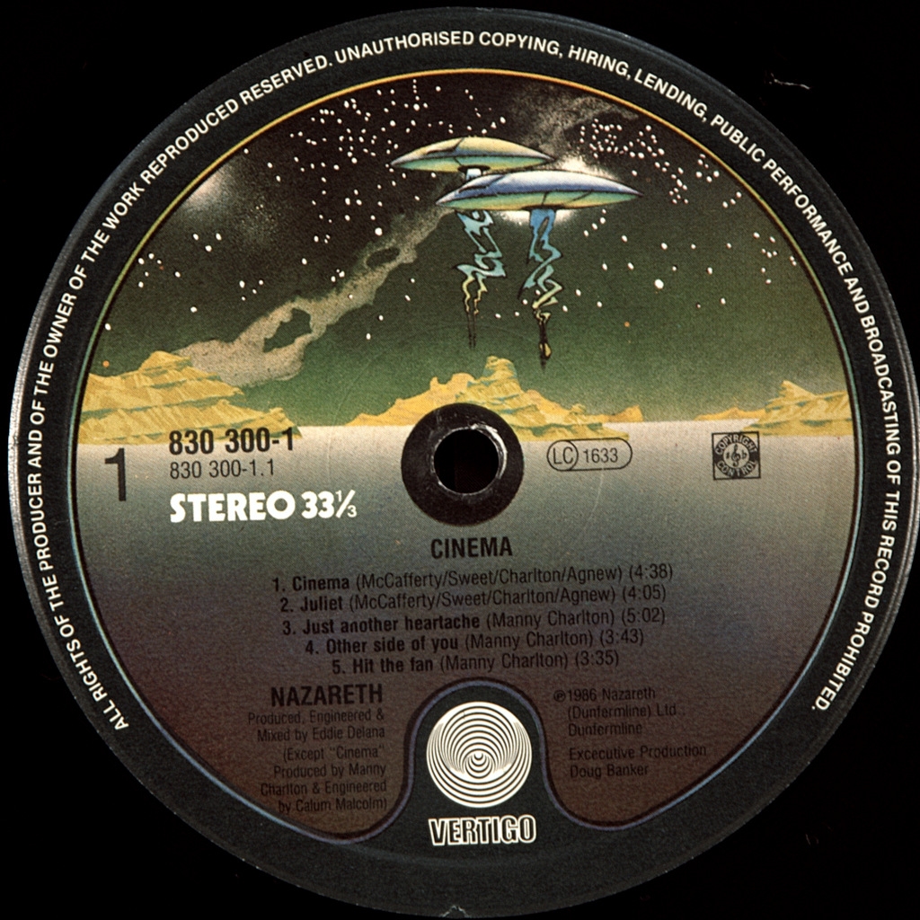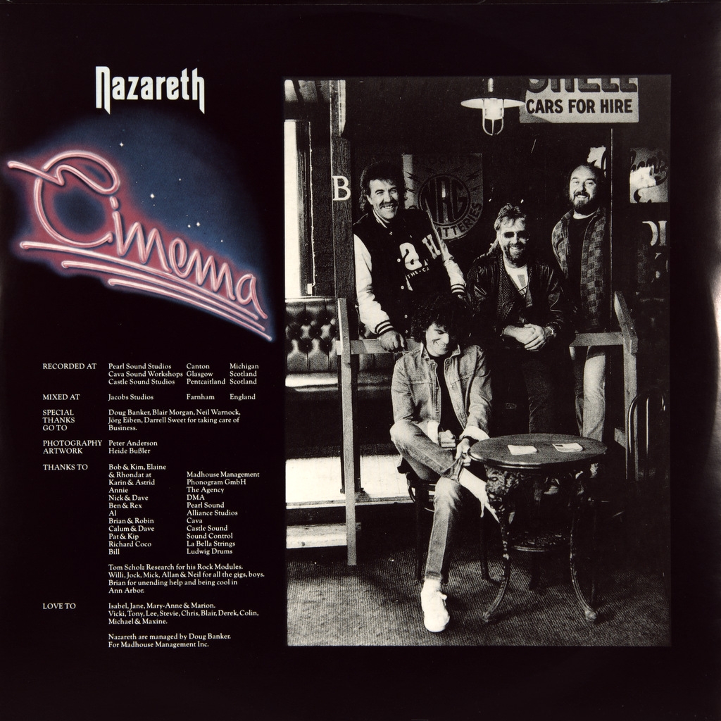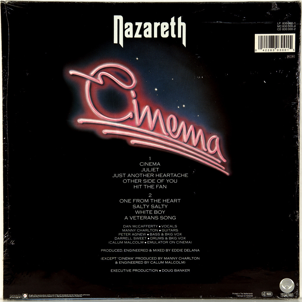 NAZARETH-CINEMA-1986- ПЕРВЫЙ ПРЕСС UK/EU HOLLAND-VERTIGO-830300-1. Редкий оригинал единственного издания на виниле в Европе. Шестнадцатый альбом шотландской рок-группы Nazareth, вышедший в феврале 1986 года на Vertigo в Европе, и на A&M Records - в Америке. В Cinema группа, можно сказать, повернула к своим корням, к старому доброму хард-року, за который их и полюбили в семидесятых. Альбом практически целиком состоит из номеров, которые показывают Nazareth с этой стороны. Материал к Cinema состоит наполовину из песен коллективной работы, наполовину - из сочинений Манни Чарлтона. Всё это - крепко сбитый хард-рок, что делает честь Nazareth вернуться к музыке, которую в конце 1980-х почти никто уже не делал.