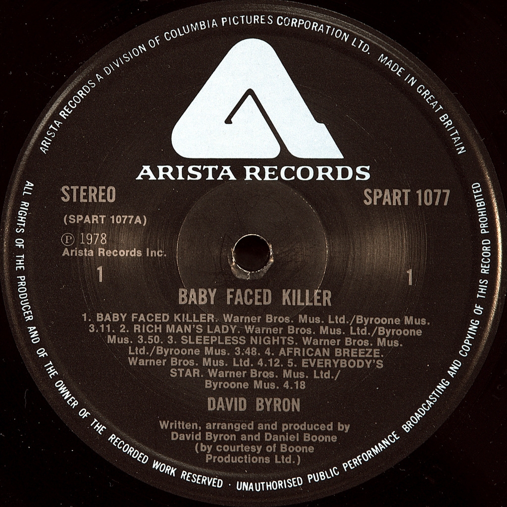 BYRON,DAVID-BABY FACED KILLER-1978-ПЕРВЫЙ ПРЕСС UK-ARISTA-SPART1077. Мега редкий сольный альбом фронтмена URIAH HEEP. Это вторая сольная и третья работа вне URIAH HEEP. Критики сдержано оценивают работу , с чем очень не согласны фанаты. ALLMUSIC оцениват работу в 3 звезды.