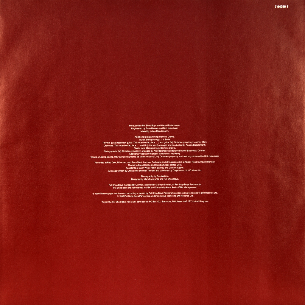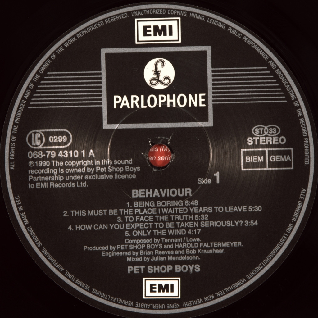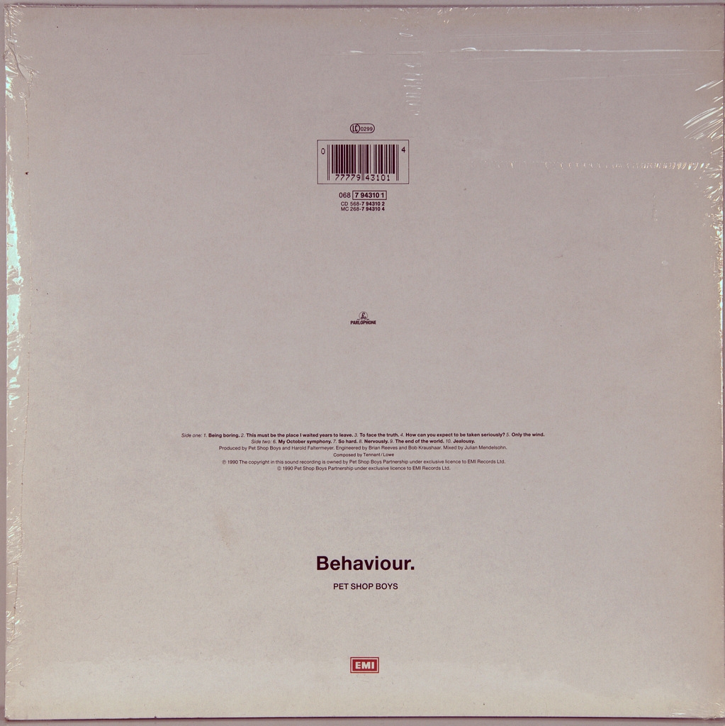 PET SHOP BOYS-BEHAVIOUR-1990-ПЕРВЫЙ ПРЕСС GERMANY-PARLOPHONE-068-7943101. Редкий оригинал культовой группы. Behaviour— четвёртый студийный альбом британской поп-группы Pet Shop Boys, вышедший в 1990 году. Диск значительно отличается от предыдущих работ дуэта, построенных под сильным влиянием итало-диско и Hi-NRG; здесь же практически ни одна из альбомных композиций не является танцевальной. Behaviour получил лестные рецензии и достиг 2-го места в британском хит-параде (вышли также альбомные хит-синглы «So Hard» и «Being Boring»). По продажам в Великобритании альбом стал платиновым, в США — золотым.