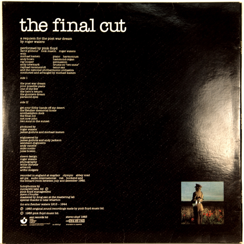 PINK FLOYD-FINAL CUT-1983-ПЕРВЫЙ ПРЕСС UK-HARVEST номер SHPF1893/oc064-65042 Матрицы A-1U-1-2/B-2U-1-1. Это последний альбом Pink Floyd, в записи которого участвовал Roger Waters. Альбом посвящён отцу Roger Waters погибшему во Второй мировой войне. Редкий английский оригинал.