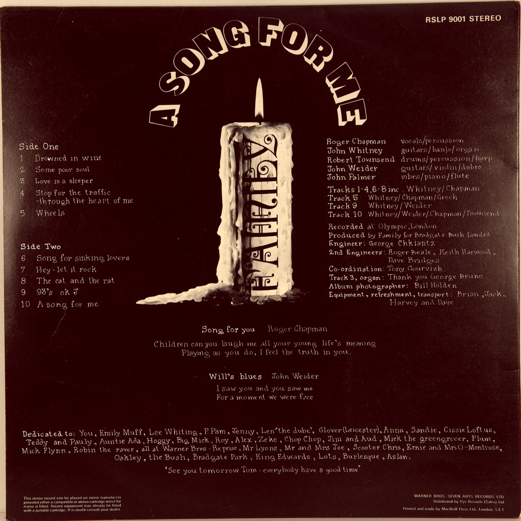 FAMILY-A SONG FOR ME-1970-ПЕРВЫЙ ПРЕСС UK-REPRISE-RSLP9001. Очень редкий британский оригинал культового альбома. A Song for Me — третий студийный альбом британской рок-группы Family, записанный в лондонской студии Olympic и выпущенный звукозаписывающей компанией Reprise 23 января 1970 года. 7 февраля альбом поднялся до #4 в UK Albums Chart, ознаменовав наивысшее достижение группы в чартах.