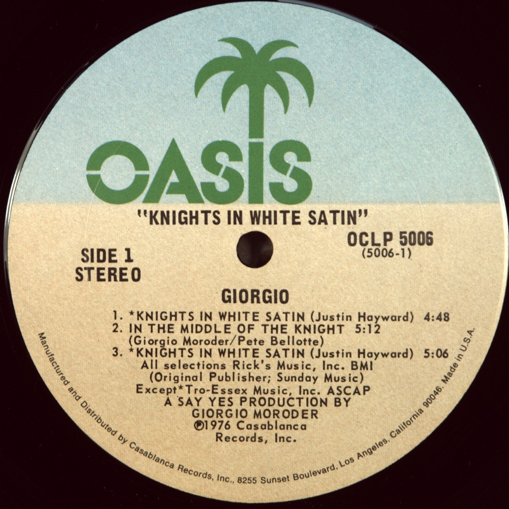 MORODER, GIORGIO-KNIGHTS IN WHITE SATIN-1976-ПЕРВЫЙ ПРЕСС USA-OASIS-OCLP5006. Редкий оригинал дискового альбома от! GIORGIO MORODER - пионер электронной музыки, один из первооткрывателей диско-музыки 1970-х годов, основоположник итало-диско, автор музыки к кинофильмам. Knights in White Satin - пятый альбом итальянского музыканта, композитора и продюсера.