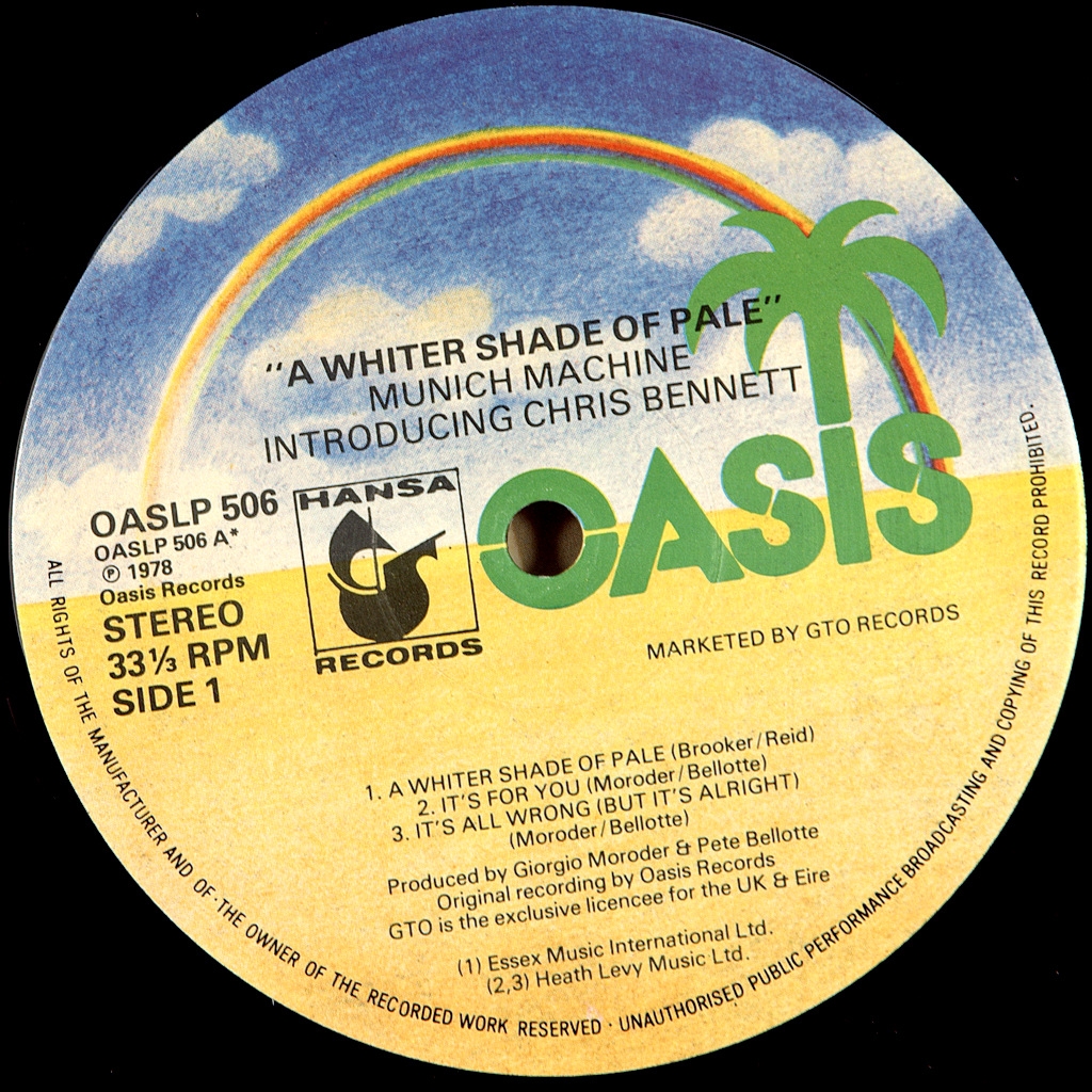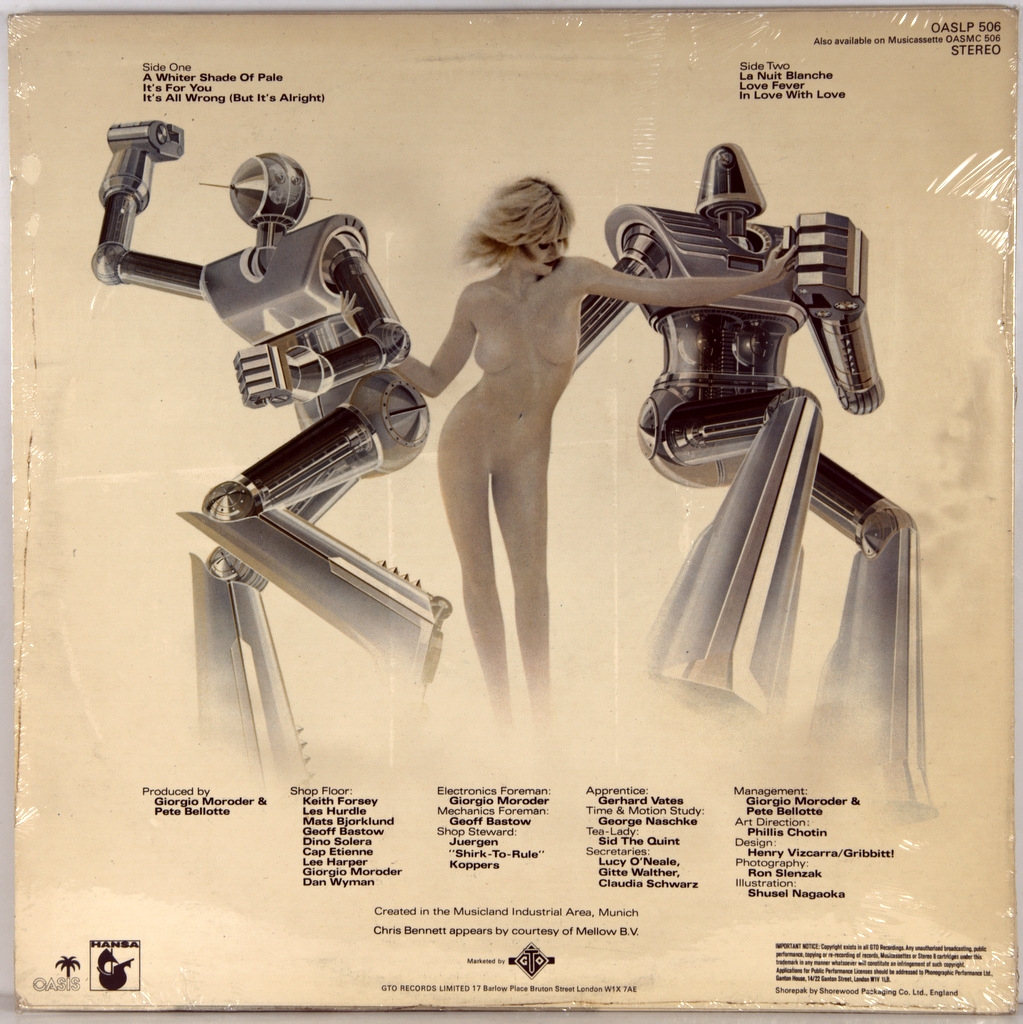 MUNICH MACHINE/CHRIS BENNETT-A WHITER SHADE OF PALE-1978-ПЕРВЫЙ ПРЕСС UK-OASIS-OASLP506. Редкий британский оригинал культового альбома. Munich Machine --диско-проект основан в Мюнхене, Германия, под руководством Giorgio Moroder и при участии продюсеров Pete Bellotte, Stefan Wissnet, Günther Moll и других. Знаменитая "Мюнхенская машина" - фабрика по производству первокачественного европейского диско стоит практически за всеми проектами Giorgio Morodera. Munich Machine - A Whiter Shade of Pale - второй альбом диско-проекта Munich Machine, вышедший в 1978 году на Oasis Records. На этом альбоме впервые появляется Chris Bennett, молодая талантливая певица, еще одно открытие Morodera. Она снялась на обложку альбома абсолютно нагой. На лицевой стороне она еще стыдливо прикрывает свою пышную грудь, но на задней стороне, открыто потрясая той же грудью, танцует между пляшущими роботами - веселым символом The Munich Machine, созданным японским художником-иллюстратором Шусеи Нагаока. A Whiter Shade of Pale - старый хит 1967 года английской группы Procol Harum, вдохновленный музыкой Иоганна Себастьяна Баха.