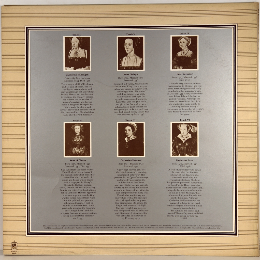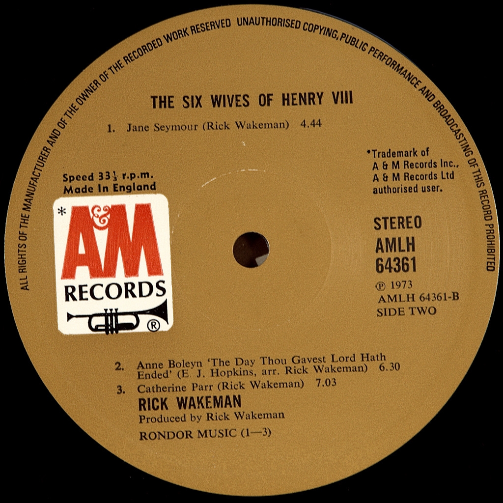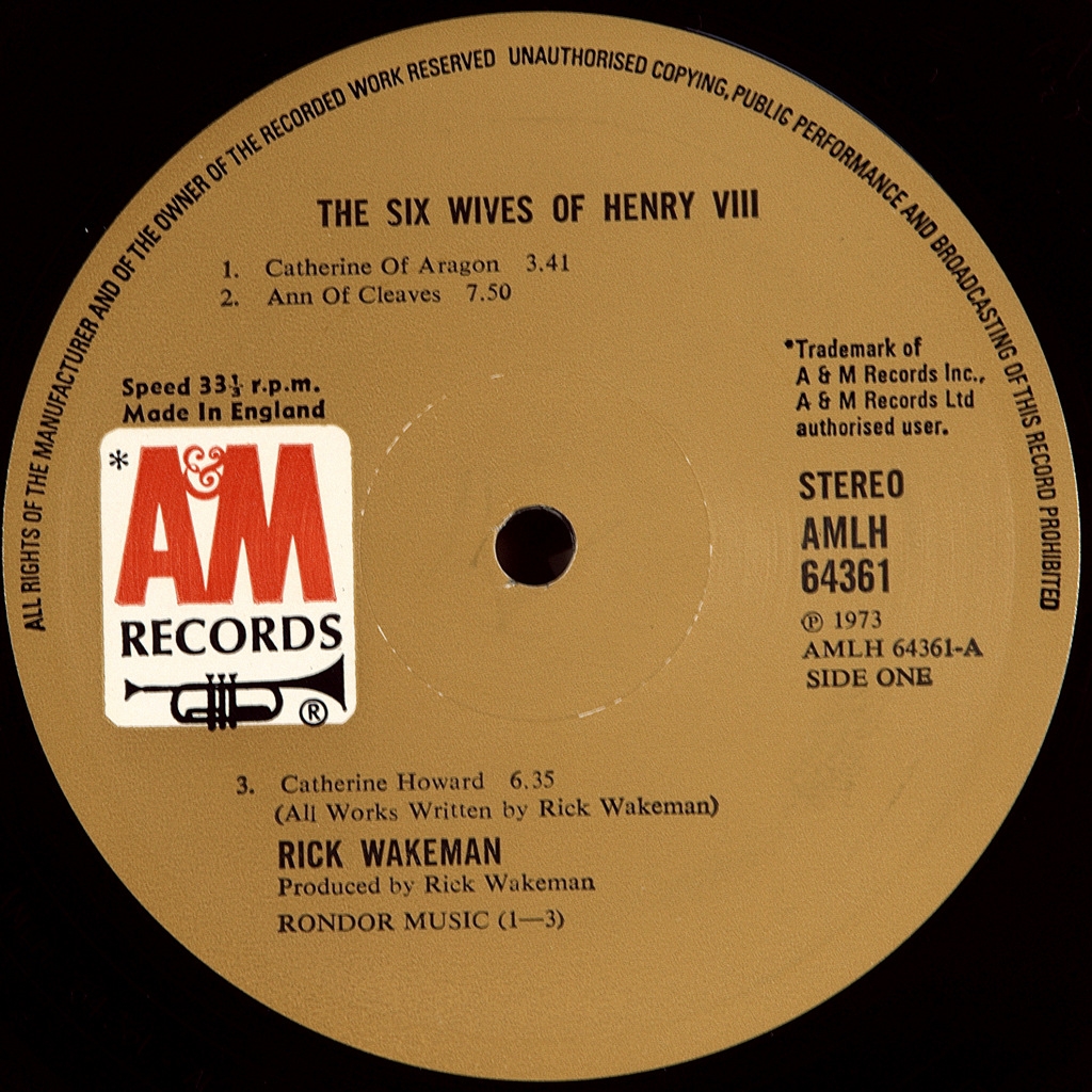 WAKEMAN, RICK-SIX WIVES OF HENRY VIII-1973-ПЕРВЫЙ ПРЕСС UK-A&M-AMLH64361. Матрицы A-1/B-1. Редкий британский оригинал . Второй студийный альбомом английского клавишника Rick Wakeman , выпущенным в январе 1973 года на A & M Records. Он достиг № 7 в чарте альбомов Великобритании и № 30 на Billboard 200 в Соединенных Штатах. Он был сертифицирован золотом Ассоциацией звукозаписывающей индустрии Америки в 1975 году и продан в США более 500 000 копий.