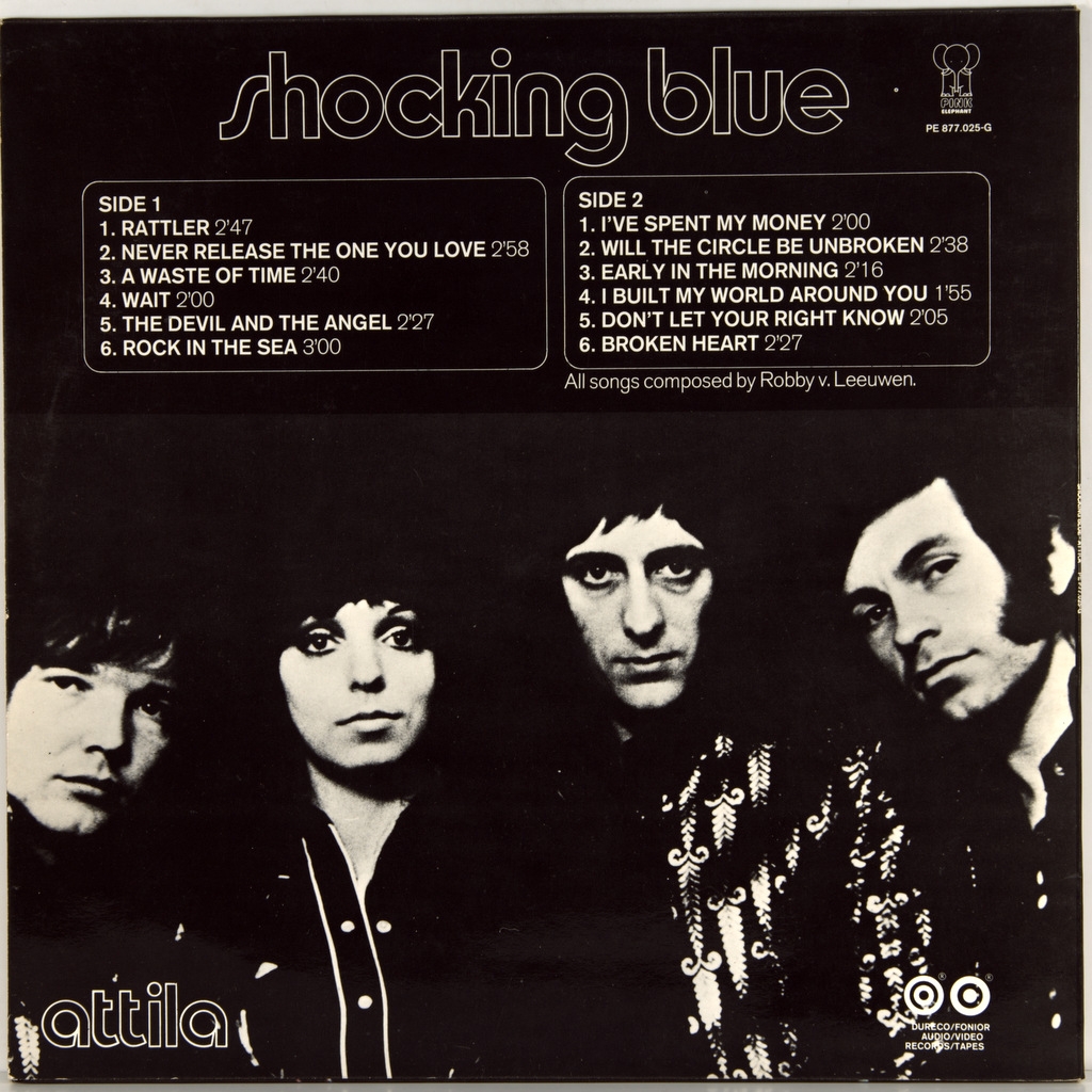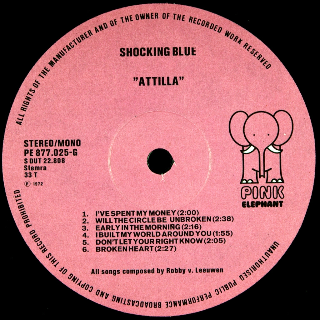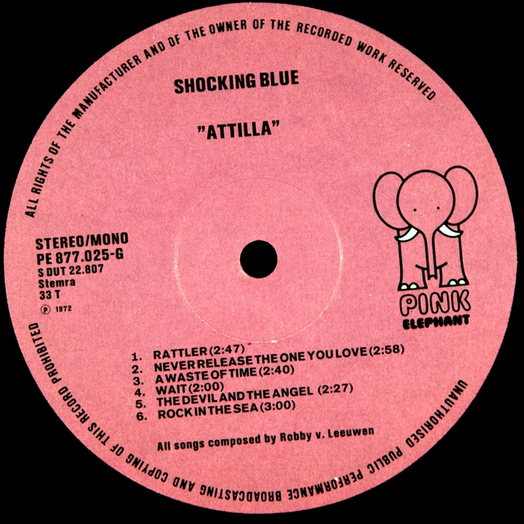 SHOCKING BLUE-ATTILA-1972-ПЕРВЫЙ ПРЕСС HOLLAND-PINK ELEPHANT--PE877025G. Очень редкий оригинал великой группы. "Attila" - 6-й альбом голландской поп-группы "Shocking Blue". Записывался сразу же после выпуска предыдущего альбома "Inkpot" и вышел в том же, 1972-м году на лейблах Pink Elephant в Голландии и Polydor в Германии. Немецкое издание носило другое название - "Eve And The Apple", соответственно и первая композиция "Rattler" был заменана на композицию "Eve And The Apple", которая в Голландии предназначалась для сингла.