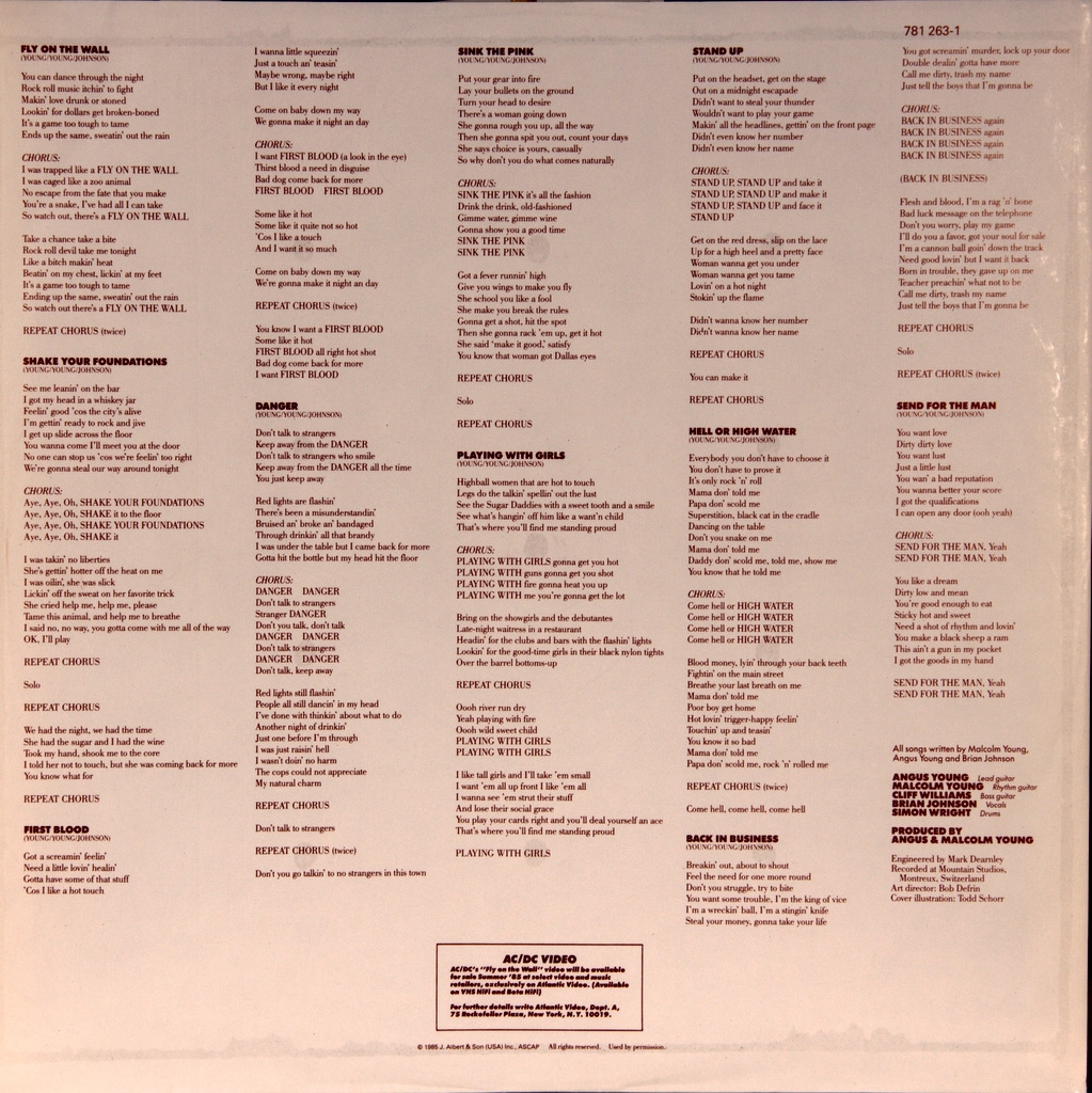 AC/DC-FLY ON THE WALL-1985-ПЕРВЫЙ ПРЕСС UK/EU-GERMANY -ATLANTIC-781263-1. Редкий оригинал культовой группы. Fly on the Wall - десятый австралийский и девятый международный студийный альбом австралийской хард-рок-группы AC/DC, релиз которого состоялся 28 июня 1985 года. Второй и последний альбом группы, спродюсированный участниками коллектива Ангусом и Малколмом Янгами. Также альбом стал дебютным для нового ударника Саймона Райта, который был принят в группу после ухода Фила Радда в 1983 году. Как и предыдущий (Flick of the Switch), данный альбом не получил коммерческого успеха (в сравнении с Back in Black и For Those About to Rock (We Salute You)). Музыкальные критики оценили его довольно низко. Несмотря на это, альбом был продан тиражом более 1 000 000 экземпляров и получил платиновый статус.