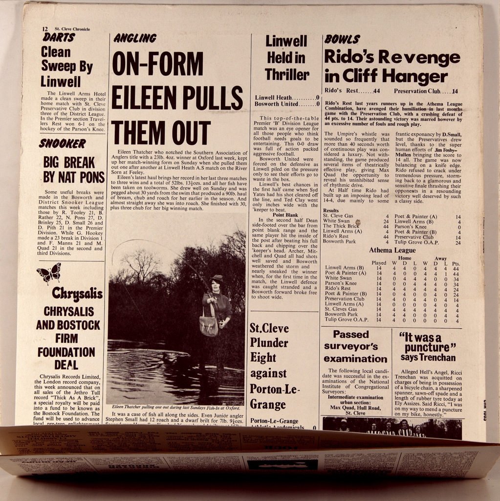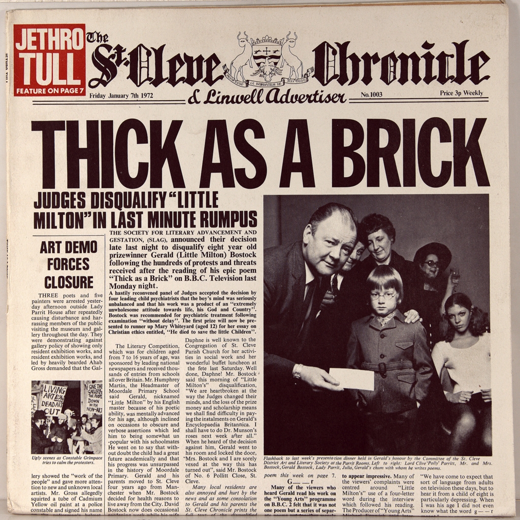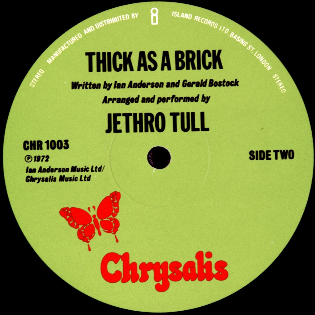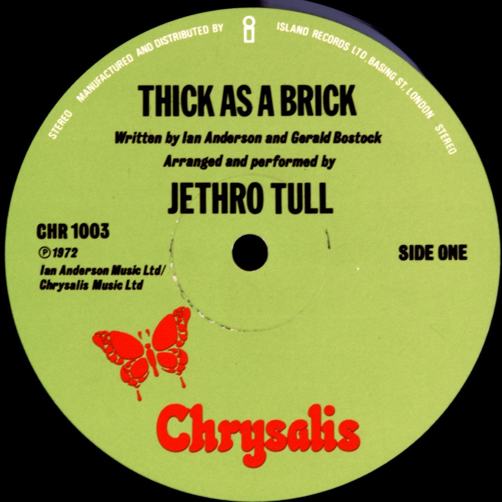JETHRO TULL-THICK AS A BRICK-1972-ПЕРВЫЙ ПРЕСС UK-CHRYSALIS- номер CHR1003 матрицы A-3U/B-2U PORKY/PESKO. Thick as a Brick - пятый студийный альбом британской рок-группы Jethro Tull, выпущенный в 1972 году. Записан в декабре 1971 года в Morgan Studios, Лондон. Во многом является новаторским — по музыке, по длительности композиции, по оформлению. Любимый альбом Иэна Андерсона, по его утверждению в 2009 году, Сложная по структуре композиция, состоящая из нескольких частей, по строению похожа на классическую симфонию, хотя в ней встречаются элементы джаза и фолка. Даже состав используемых музыкальных инструментов был необычным. Помимо привычных для группы флейты, гитар, клавишных и ударных, на альбоме звучат клавесин, ксилофон, скрипка, лютня, труба, саксофон, тимпан.