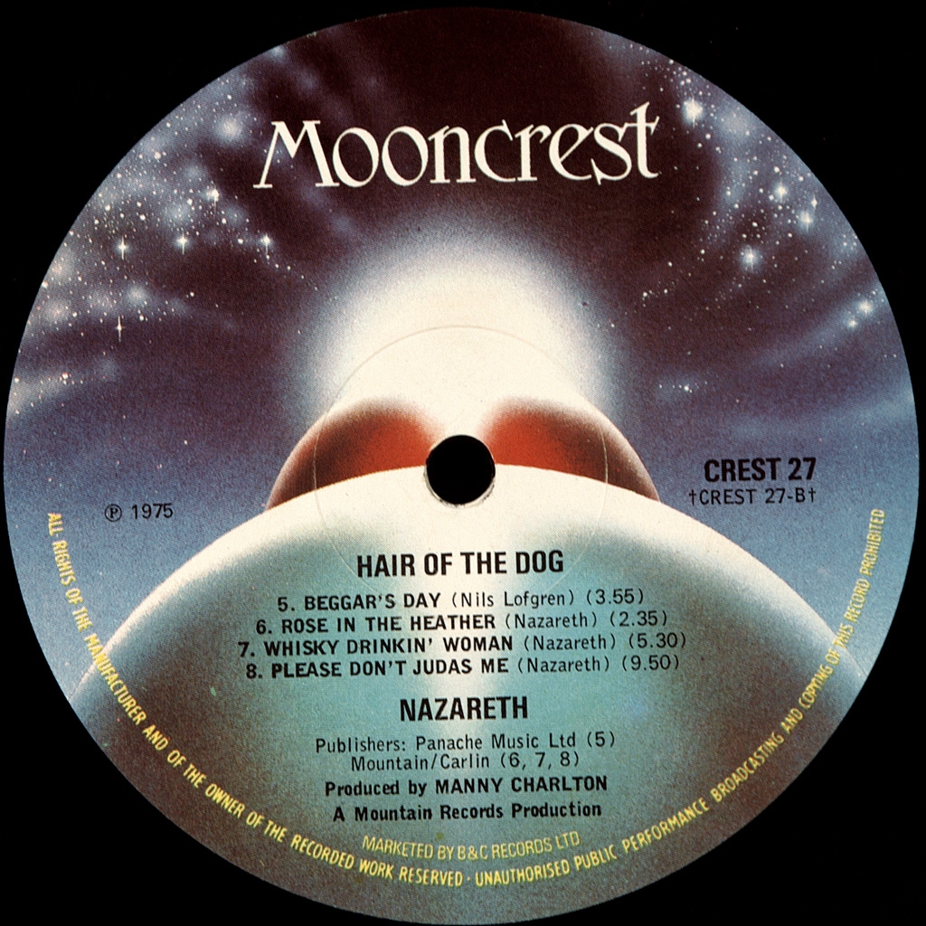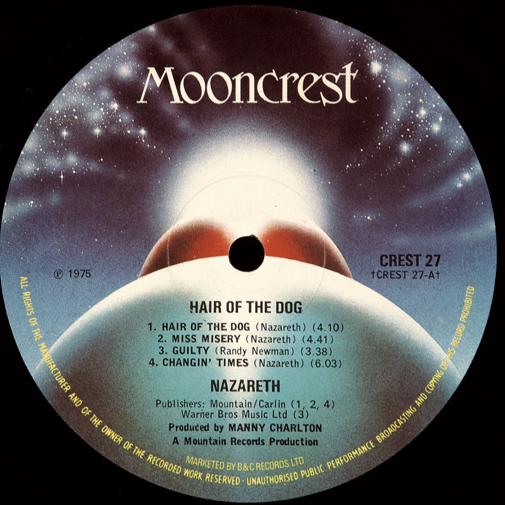 NAZARETH-HAIR OF THE DOG-1975-Первый пресс UK-MOONCREST-CREST 27. Матрицы A-2U/B-1U. Стампера 1M/1A (Мечта!) .Hair of the Dog — шестой студийный альбом шотландской рок-группы Nazareth, вышедший в 1975 году. Выпущен в апреле 1975 года лейблом Mooncrest в Великобритании, A&M Records — в Северной Америке. Самый коммерчески успешный альбом группы, по всему миру продано более двух миллионов экземпляров. В 2002 году занял 51-ую позицию в рейтинге «100 лучших рок-альбомов всех времён» по версии журнала Classic Rock.