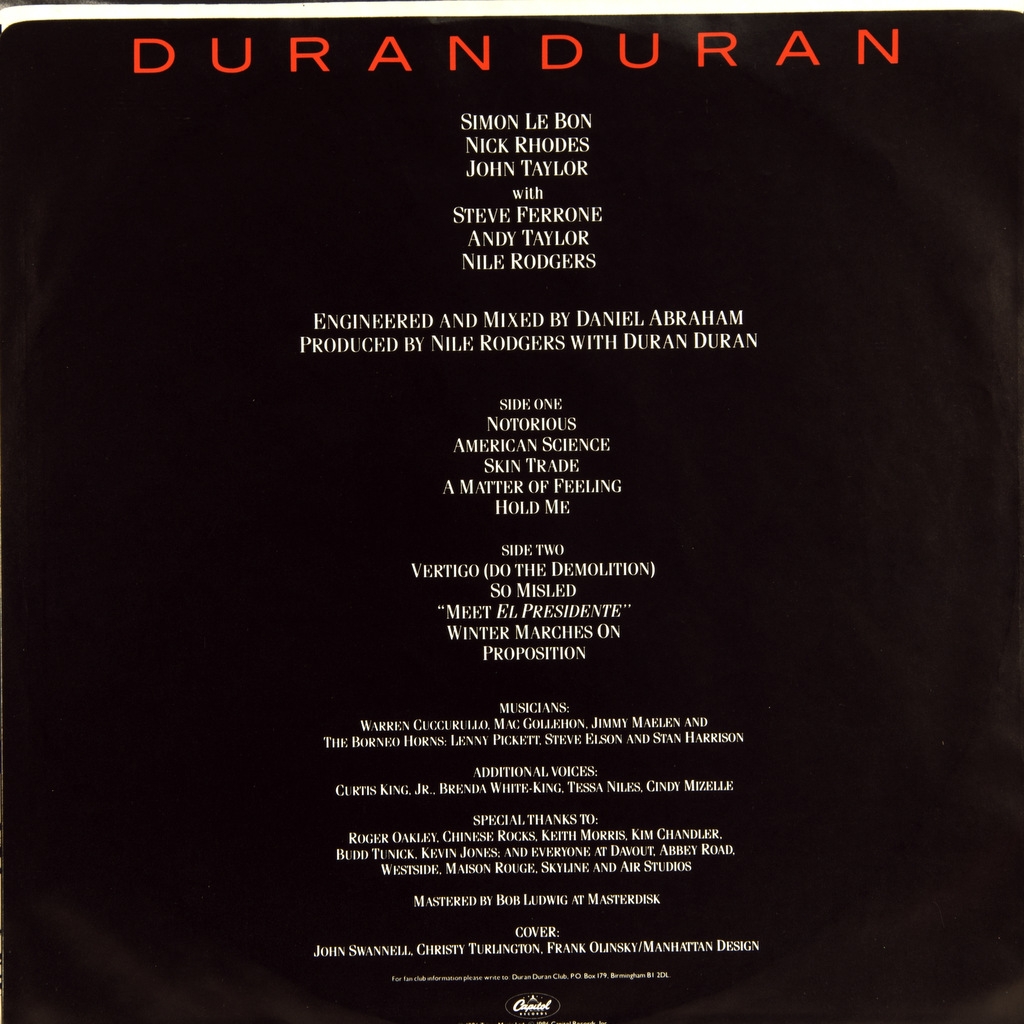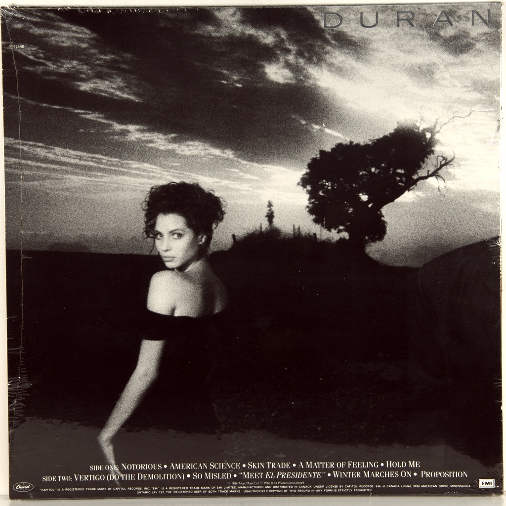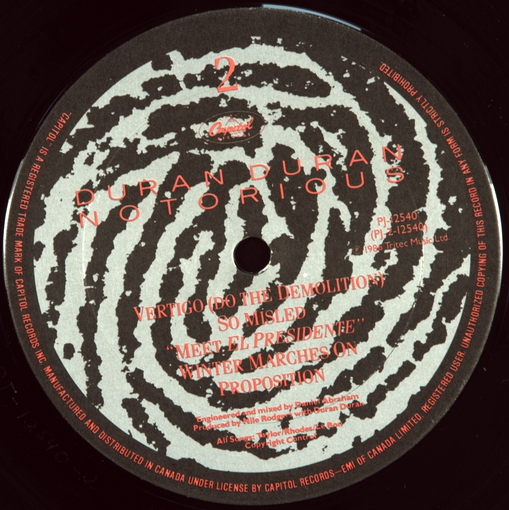 DURAN DURAN-NOTORIOUS-1986-ПЕРВЫЙ ПРЕСС CANADA-EMI-PI12540. Редкий американский оригинал. Notorious — четвёртый студийный альбом британской нью-вейв-группы Duran Duran, выпущенный 18 ноября 1986 года. Продюсером данного релиза в этот раз выступил работавший уже ранее с группой при продюсировании синглов «The Reflex» и «Wild Boys», гитарист группы Chic — Найл Роджерс. Он также сыграл на гитаре на главном сингле альбома — «Notorious». Это единственный сингл альбома, который смог достичь былого коммерческого успеха (2 — е место в США и 7 — е место в Великобритании).