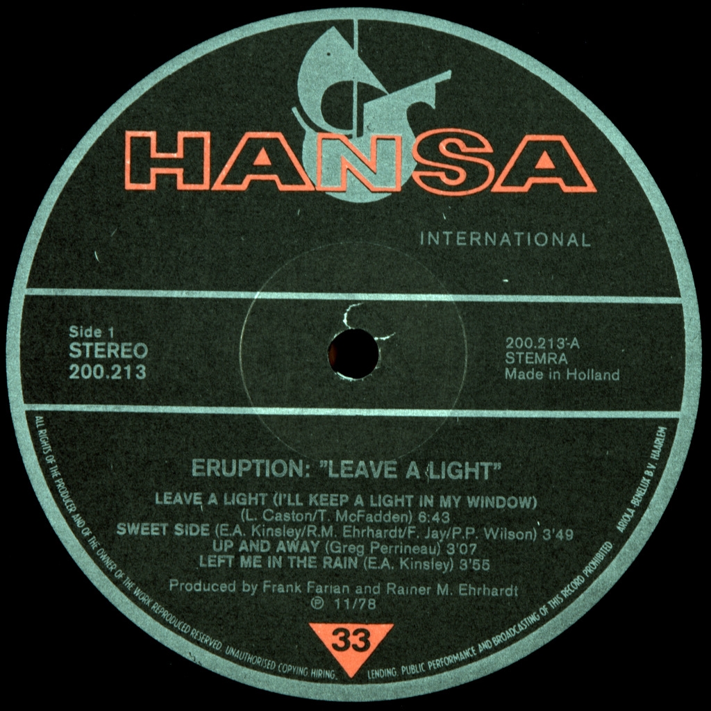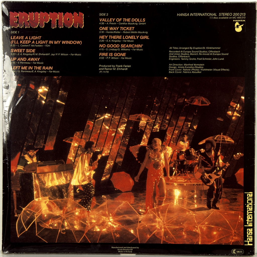 ERUPTION-ONE WAY TICKET-1978-ПЕРВЫЙ ПРЕСС HOLLAND-HANSA-200213 Редкий оригинал культового альбома диско. В Нидерландах выпуск оригинала прошел с измененной обложкой и названием альбома из маркетинговых соображений. One Way Ticket — песня группы «Eruption» из альбома Leave a Light (1978). В России и странах бывшего СССР известна также как «Синий иней» или «Синяя песня». Известность песня получила благодаря исполнению британской диско-группой ERUPTION для их второго альбома «Leave a Light». В первой половине 1979 года песня стала европейским хитом, возглавив чарты в Австрии и Швейцарии.