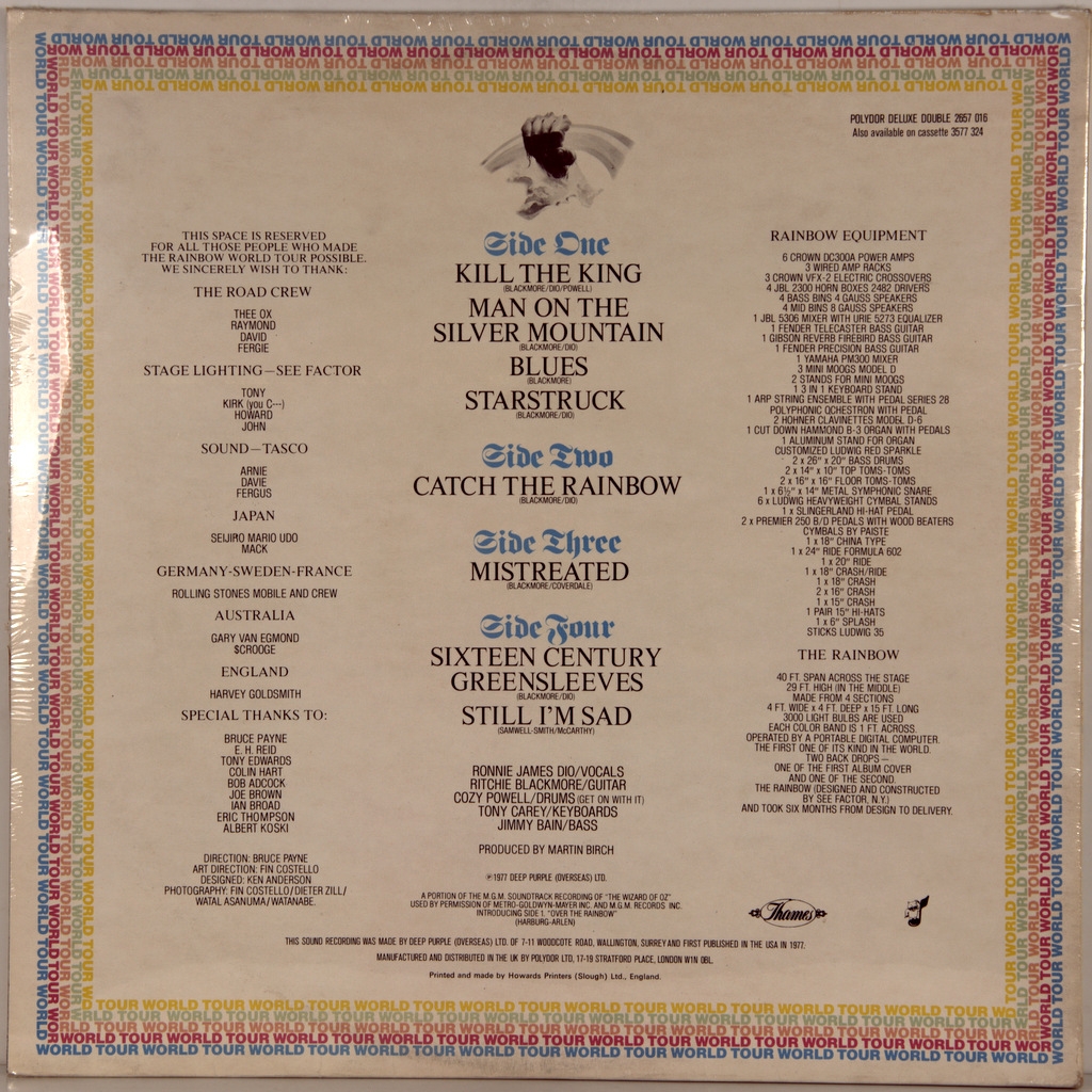 RAINBOW-ON STAGE (2 LP'S)-1977-ПЕРВЫЙ ПРЕСС UK-POLYDOR OYSTER- 2657016,2929-041/42 Матрицы A-2/B-2/A-7/B-7 Masterdisc G.K. On Stage — концертный альбом британско-американской группы Rainbow, выпущенный в 1977 году. В альбом вошли композиции, записанные во время концертов в Германии и Японии в ходе концертного тура в поддержку альбома Rising в 1976 году. Некоторые треки являют собой слияние версий песни с разных концертов. Кроме того, длительность композиций была откорректирована для того, чтобы уместить их на четыре стороны винилового издания.