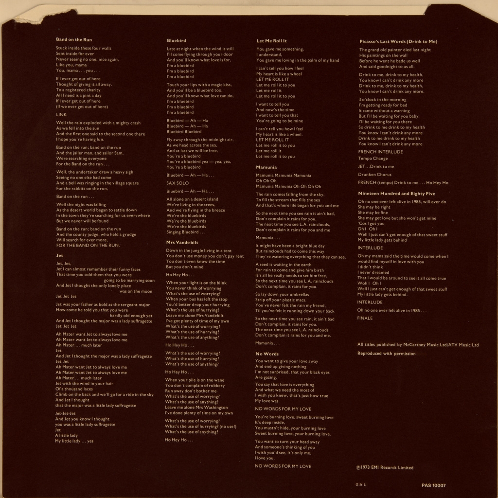 WINGS-BAND ON THE RUN-1973-UK ПЕРВЫЙ ПРЕСС-APPLE - PAS10007 матрицы A-2/B-2 Один из выдающихся альбомов 70-х. Band on the Run — третий студийный альбом английской группы Wings (пятый сольный альбом Пола Маккартни), выпущенный в 1973 году. Коммерчески наиболее успешный и один из самых известных альбомов группы. Один из самых продаваемых альбомов 1974 года в Великобритании. Признан многими критиками лучшим альбомом Пола Маккартни. В 2003 году вошёл в список 500 величайших альбомов всех времён по версии журнала Rolling Stone на 418 месте. По версии New Musical Express, альбом занимает 333-е место среди 500 величайших альбомов всех времён. «Возможно, лучший альбом, выпущенный одним из четверых музыкантов, которые когда-то назывались The Beatles» (музыкальный критик журнала «Rolling Stone» Джон Ландау, январь 1974 года)