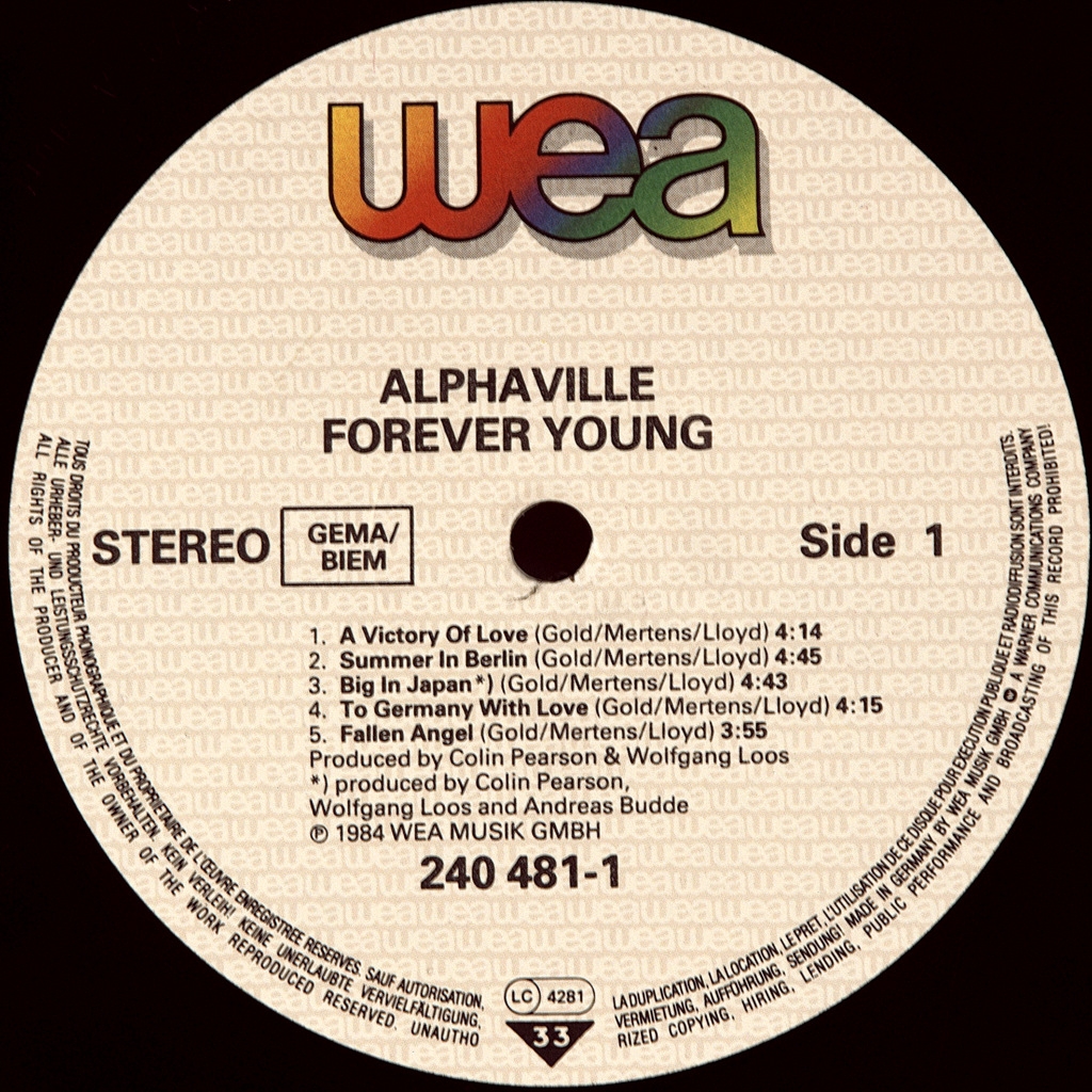 ALPHAVILLE-FOREVER YOUNG ( +POSTER) -1984-ПЕРВЫЙ ПРЕСС UK/EU-GERMANY-ATCO-240481-1. Редкий оригинал культового альбома одних из основателей новой волны.Forever Young (рус. Вечно молодой) — дебютный студийный альбом немецкой синтипоп-группы Alphaville, был выпущен 27 сентября 1984 года лейблом Warner Music Group. Выходу диска предшествовал выпуск нескольких синглов — «Big In Japan» в январе, Sounds Like A Melody в мае и Forever Young в сентябре, перед самым выходом пластинки. Альбом разошёлся тиражом более 2 000 000 копий. Песня Forever Young не стала первоначально популярным хитом, но с некоторых пор считается классикой 1980-х. В некоторые экземпляры немецких виниловых альбомов были вложены большие плакаты.