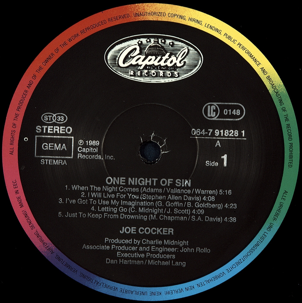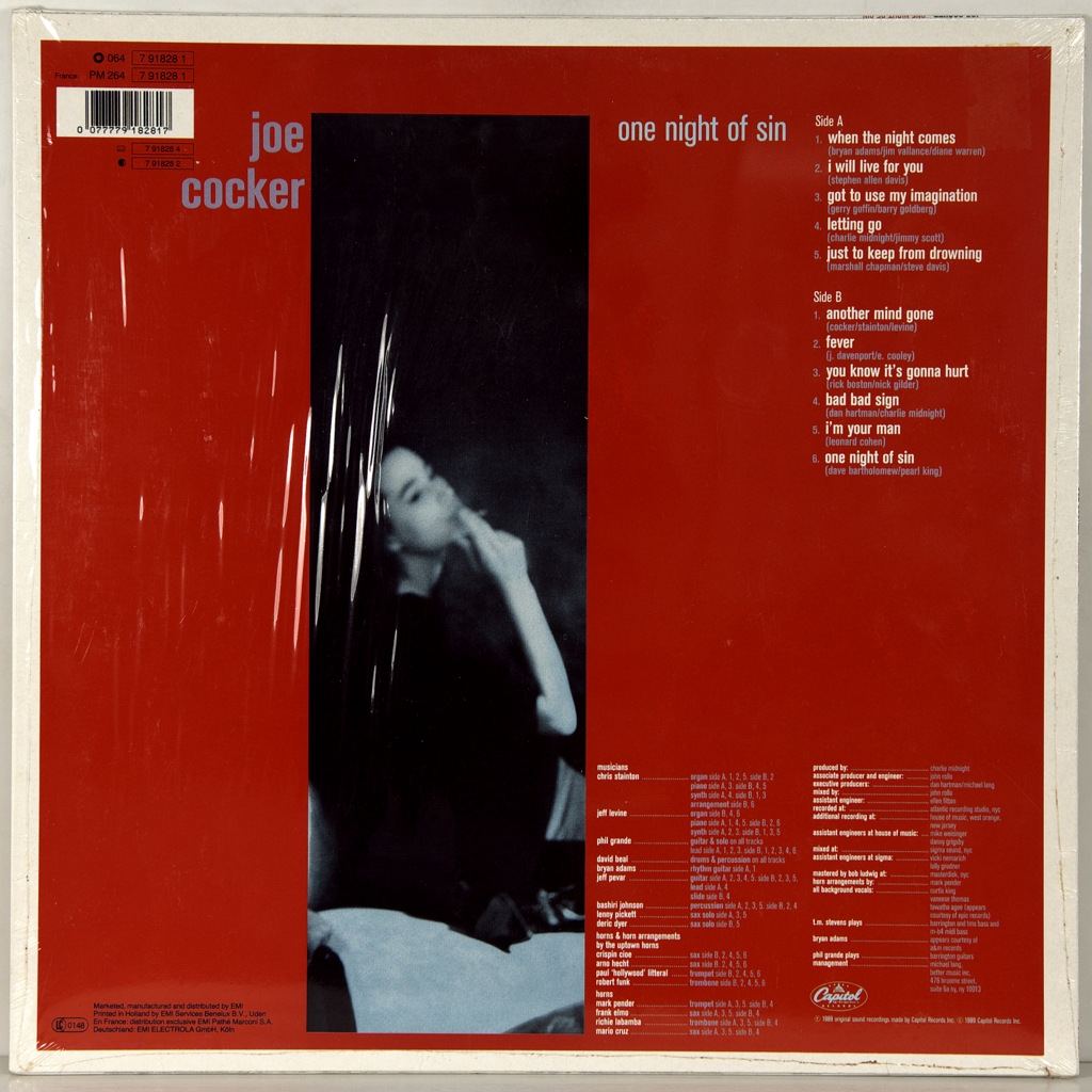 COCKER, JOE-ONE NIGHT OF SIN-1989-ПЕРВЫЙ ПРЕСС GERMANY-CAPITOL-064-791828-1. Европейский оригинал культового альбома. One Night Of Sin-двенадцатый студийный альбом английского певца Джо Кокера, выпущенный лейблом Capitol Records в июне 1989 года. Он содержит хит-сингл "When the Night Comes" (US #11), который был последним хитом Кокера в США Top 40. Песня примечательна еще и тем, что ее написали Брайан Адамс и Джим Вэлланс . Кроме того, первый играет на ритм-гитаре над песней. Другие известные песни на альбоме включают кавер-версию "One Night" (здесь как "One Night Of Sin"), хит № 1 Элвиса Пресли 1958 года и "i'm Your Man" Леонарда Коэна. В альбоме также есть "Another Mind Gone", которая стала первой песней за шестнадцать лет, написанной в соавторстве с самим Кокером. Песня была посвящена Би Джею Уилсону, бывшему товарищу Кокера по группе и другу.