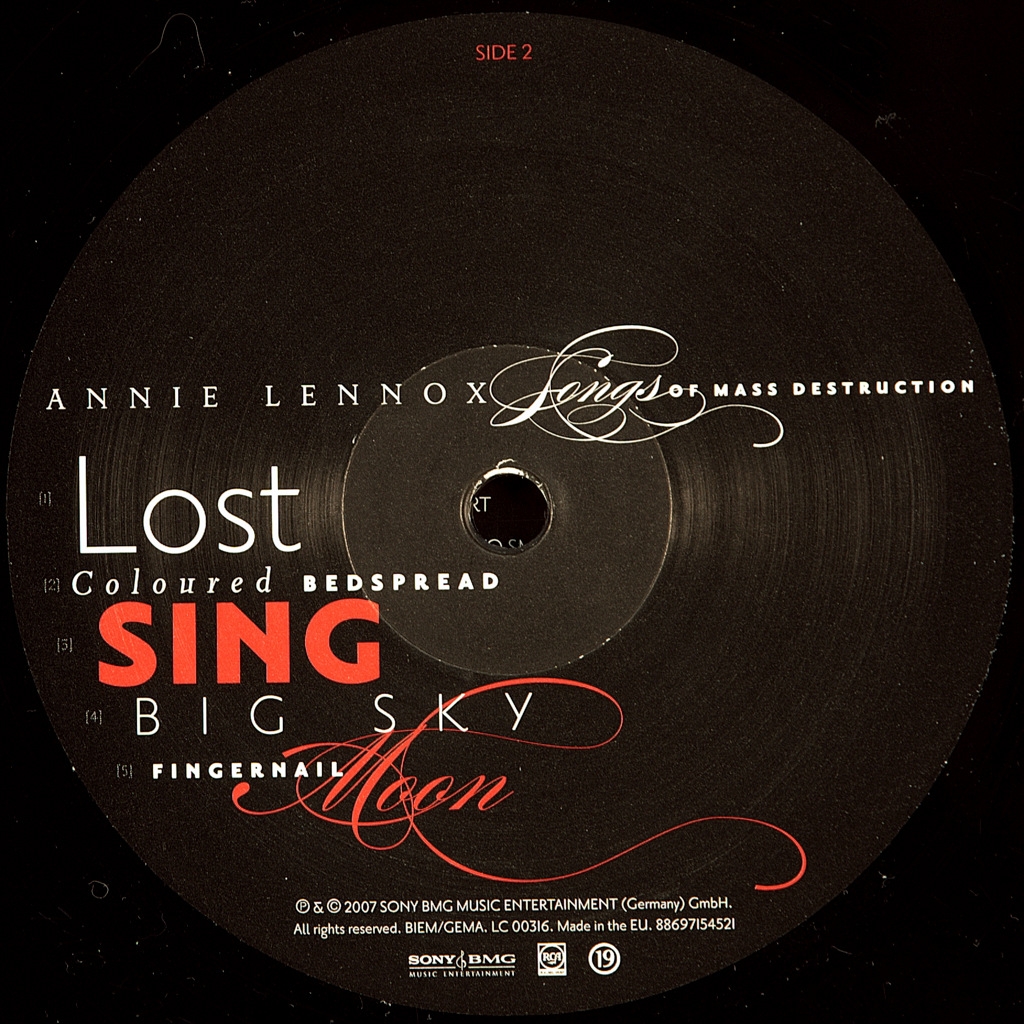 LENNOX, ANNIE-SONGS OF MASS DESTRUCTION-2007-ПЕРВЫЙ ПРЕСС UK/EU GERMANY - SONY-88697154521, Мега редкий оригинал сольного альбома A, Lennox, Songs of Mass Destruction-четвертый студийный альбом Энни Леннокс , выпущенный 1 октября 2007 года. Это был ее первый альбом с новым материалом после 2003 года и на сегодняшний день ее последний. Альбом получил положительные отзывы от критиков и показал высокие рейтинги продаж.Альбом дебютировал под номером 7 в британском чарте, где он с тех пор был сертифицирован серебряной британской фонографической индустрией . Он достиг номера 9 на американском Billboard 200, где он продал 78 000 копий в первую неделю. по данным Nielsen SoundScan , альбом был продан тиражом 275 000 экземпляров в США по состоянию на октябрь 2010 года и 71 000 экземпляров в Великобритании.
