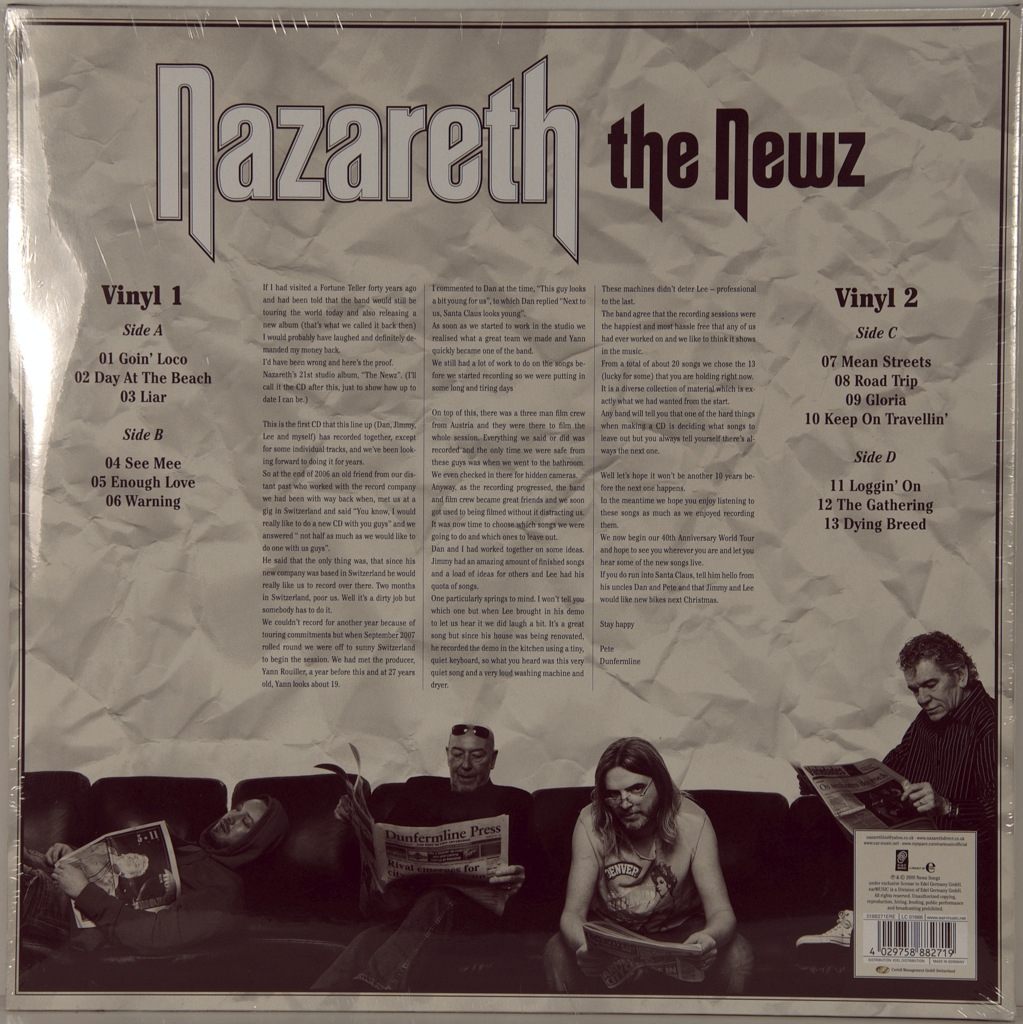 NAZARETH-NEWS-2009-ПЕРВЫЙ ПРЕСС UK/EU-GERMANY-EAR MUSIC- 4029758882719. Мега редкий оригинал (единственное издание) культовой группы The Newz-двадцать первый студийный альбом хард-рок-группы Nazareth, выпущенный в марте 2008 года. Это первый альбом группы, в котором появился новый барабанщик ли Агню, заменивший оригинального барабанщика Даррелла свита, умершего в 1999 году. Allmusic оценил альбом в 4 звезды.