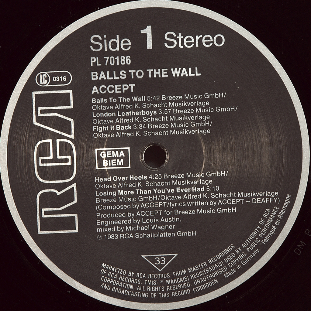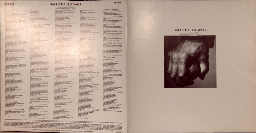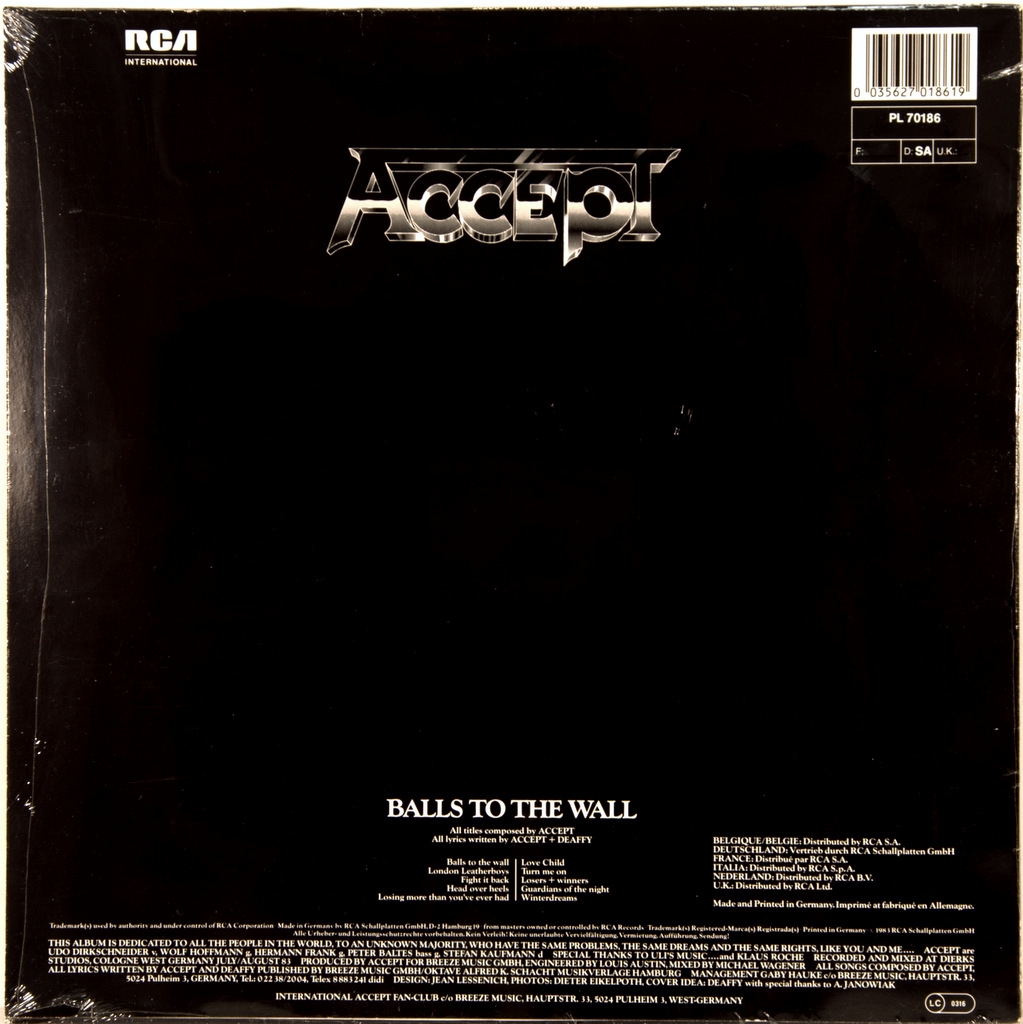ACCEPT-BALLS TO THE WALL-1983-ПЕРВЫЙ ПРЕСС GERMANY-RCA-PL70186. Очень редкий оригинал культового альбома. Balls to the Wall — пятый студийный альбом группы Accept, вышедший в 1983 году. Было продано около двух миллионов копий альбома, в США по данным RIAA диск получил золотой статус. После выпуска альбома группа провела мировое турне. Альбом занимает 62 место в списке 100 величайших хэви-метал альбомов по версии DigitalDreamDoor (DDD). Композиция «Balls to the Wall» заняла 38 место в списке VH1 «40 величайших металлических песен» и одновременно 28 место в списке VH1 «40 наихудших металлических песен».