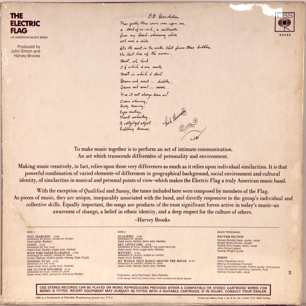 ELECTRIC FLAG – AN AMERICAN MUSIC BAND-1969-ПЕРВЫЙ ПРЕСС (MONO) UK-CBS - M63462. Очень редкий британский оригинал культовой группы в стилистике Blues Rock, Jazz-Rock, Rhythm / Blues. An American Music Band был вторым альбомом, выпущенным The Electric Flag Альбом занял 76 место в альбомном чарте.