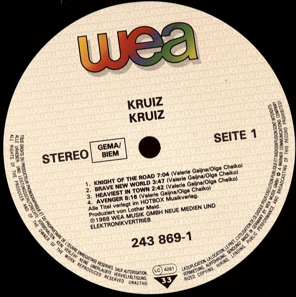 КРУИЗ-KRUIZ-1988-ПЕРВЫЙ ПРЕСС GERMANY-WEA-243869-1. Очень редкое издание советской культовой хеви группы. В 1988 году на группу "Круиз" обращает внимание немецкий продюсер Лотар Мейд (по рекомендации продюсера Scorpions Олафа Шрёттера). Он делает предложение выпустить пластинку в ФРГ, и записывают в Мюнхене первый англоязычный диск под названием "Кruiz". В составе трио (трио Kruiz) группа просуществовала с 1987 вплоть до 1990 года.