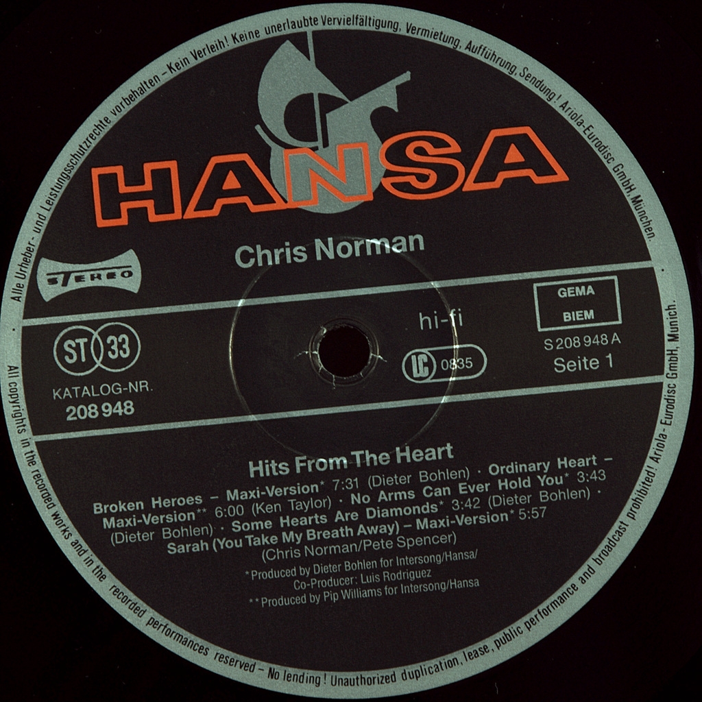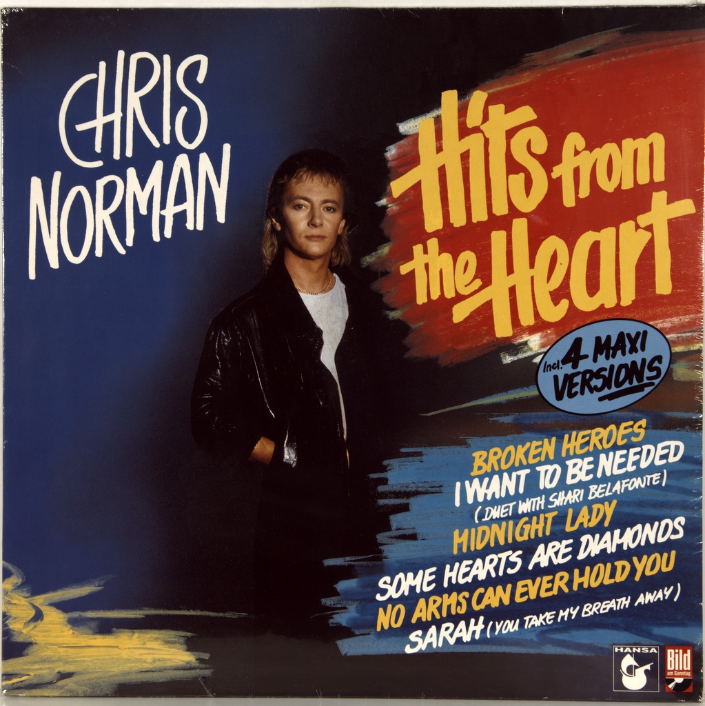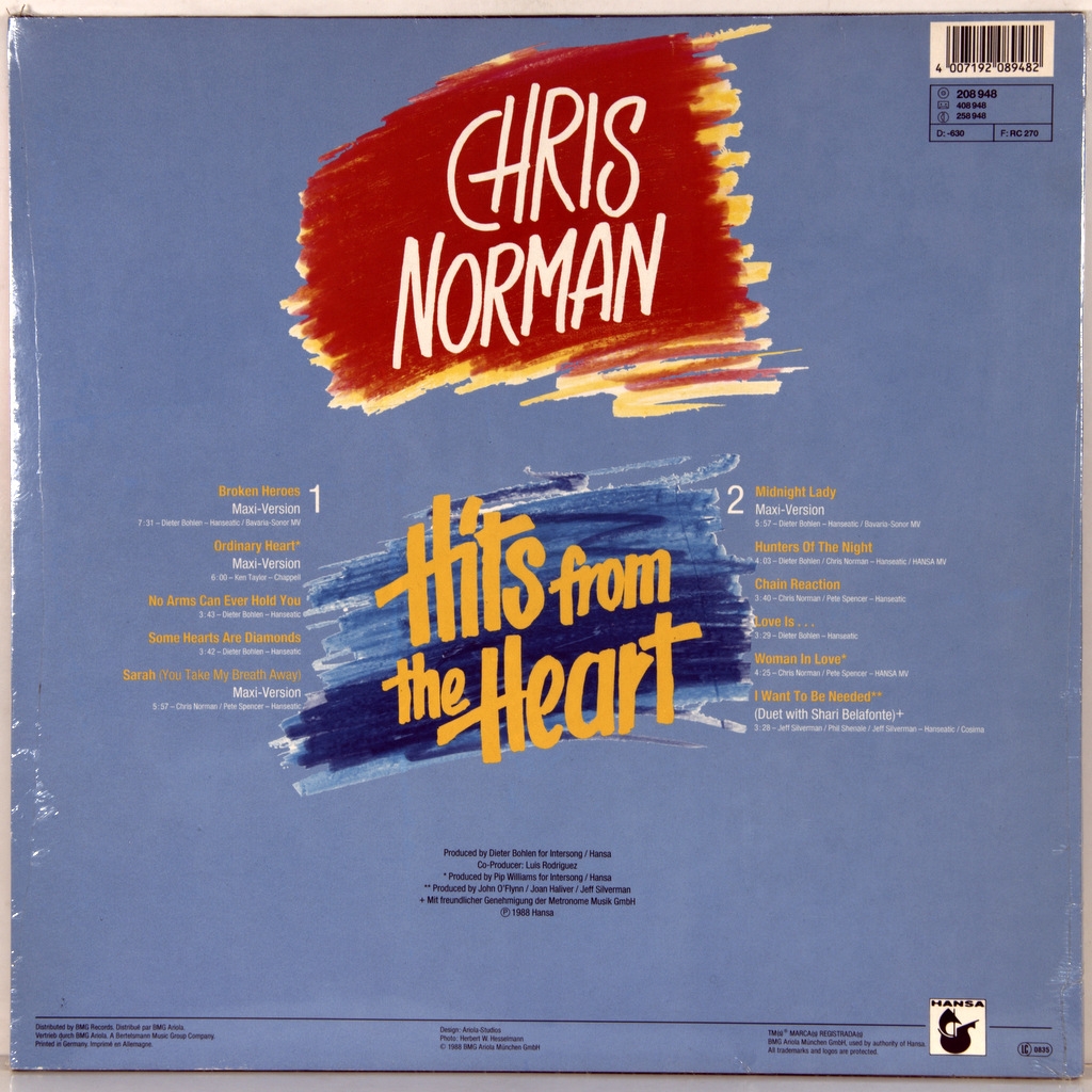 NORMAN, CHRIS (EX-SMOKIE)- HITS FROM THE HEART-1988-ПЕРВЫЙ ПРЕСС GERMANY -HANSA-208948. Очень редкий оригинал сольного альбома . На альбоме собраны все ключевые хиты двухлетней сольной карьеры. Сольная карьера Нормана началась в 1986 году с песни "Midnight Lady", которая была хитом по всей Европе, удерживая первое место в Германии в течение шести недель (где она была продана тиражом 900 000 экземпляров). дальнейший успех последовал за песнями "Some Hearts Are Diamonds", "No Arms Can Ever Hold You", "Broken Heroes", "Fearless Hearts", "Sarah" и "Baby I Miss You". в 1994 году Норман был удостоен CMT Europe звания "Международной Видеозвезды года".