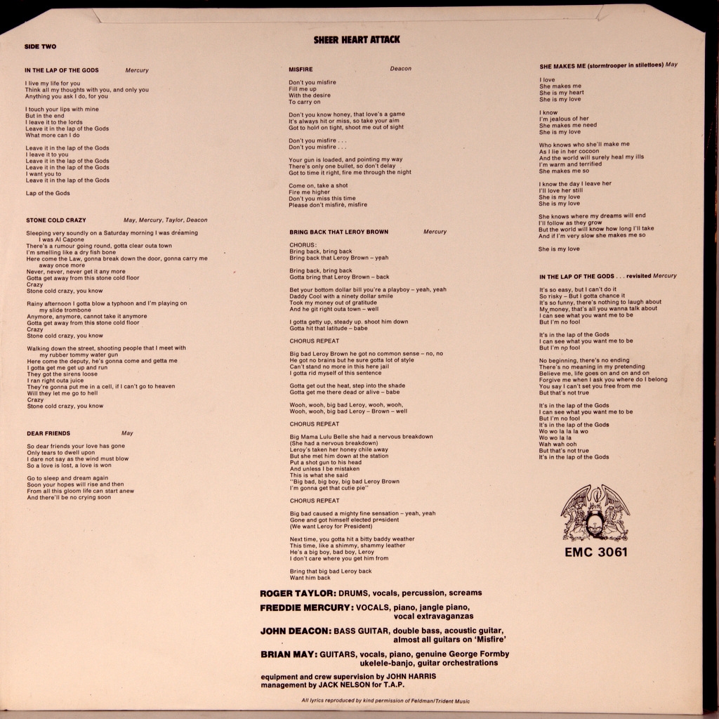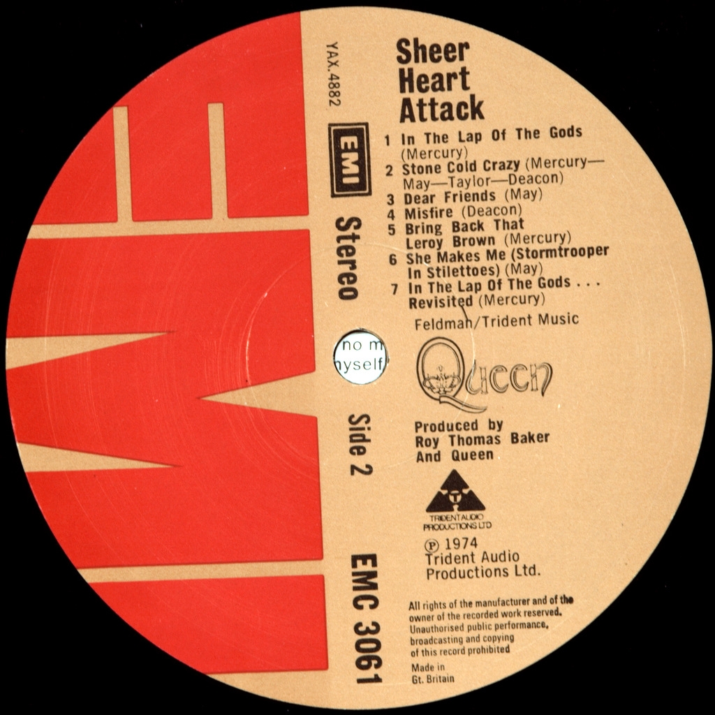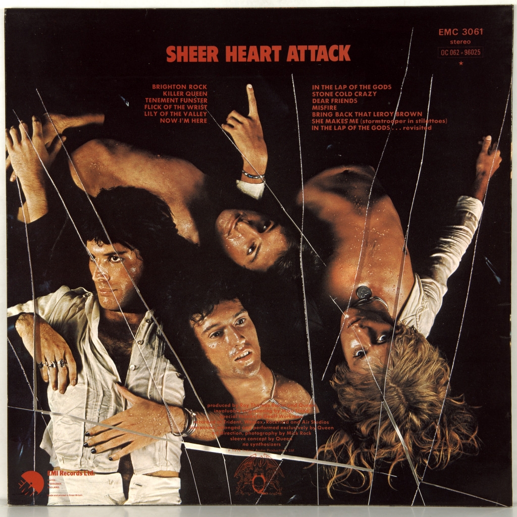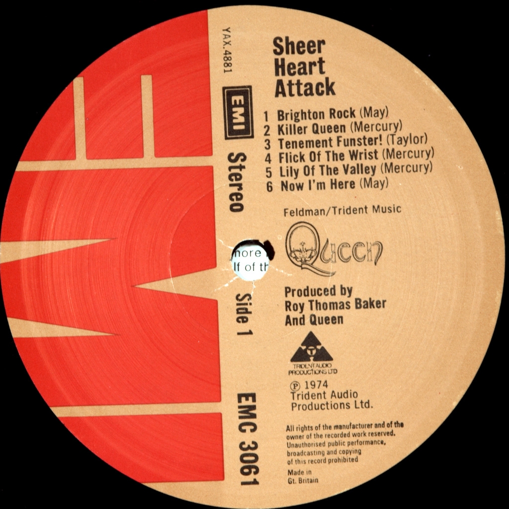 QUEEN-SHEER HEART ATTACK-1974-ПЕРВЫЙ ПРЕСС UK-EMI - EMC3061. Матрицы A-4U/B-1U. Стампера 1HO/1OO (Мечта!) Мега редкий британский экземпляр оригинала с уникальной матрицей второй стороны B-1U. Обложка из первых тысяч экземпляров печати ( без TRIDENT LOGO и CREST LOGO). Исследования приводят к мысли что скорее всего на этой комбинации матриц был запущен первый тираж 300 штук и только потом перешли к комбинациям 3/3,3/4,4/4. Об альбоме: Первая известность, равно как и коммерческий успех, пришла к группе именно с этой пластинкой, а песня «Killer Queen» стала их первым громким хитом, достигнув второго места в Англии. Сам альбом также достиг второго места в британском и 12-го в чартах Биллборд 1975 года.