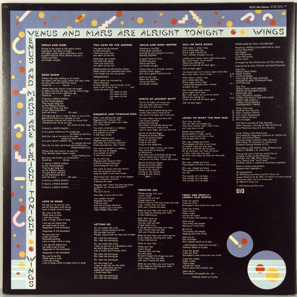 WINGS-VENUS AND MARS-1975-ПЕРВЫЙ ПРЕСС UK-CAPITOL -PCTC254 матрицы A-2U/B-1U PORKY/ROOM . Venus and Mars - четвёртый студийный альбом группы Wings, вышедший в 1975 году. Диск был выпущен после необычайного успеха Band on the Run и также стал очень популярным. Первый альбом Пола Маккартни с лейблом Capitol Records. После выхода альбома Band on the Run в состав Wings в 1974 году вошли также Джимми Маккаллох (ведущий гитарист) и Джефф Бриттон (барабанщик). После того, как Маккартни написал несколько новых песен для будущего альбома, группа в январе 1975 года вылетела в Новый Орлеан, где была запланирована запись Venus and Mars.Бриттон, повздорив с Маккалохом, ушёл из состава группы, успев поучаствовать в записи только трёх песен альбома. Ему срочно подобрали замену — американца Джо Инглиша, с которым и была продолжена запись. Маккартни сделал песни в Venus and Mars плавно переходящими друг в друга, и альбом в этом смысле стал похож на альбом The Beatles Abbey Road. Альбом был принят очень тепло, и во всех странах континента он попадает в Топ-10 чартов. По итогам , альбом года, места тоже высоки, в Британии 5 место, США- 1 место по версии Billboard-200.